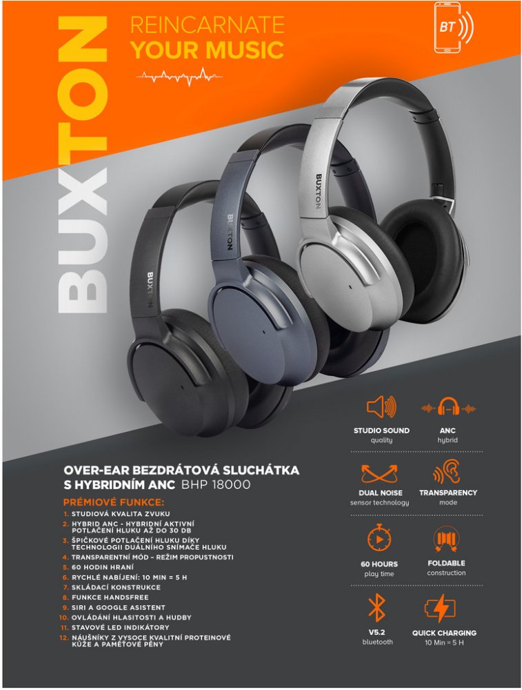 bezdrátová 32 Ohm 60 h univerzální 20000 Hz 20 Hz Buxton 105 dB/mW přes hlavu (náhlavní) 3,5 mm Jack uzavřená 249 g 40 mm USB-C