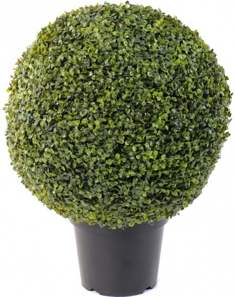 Luxusní BUXUS KOULE v květináči, 67cm je od předního evropského výrobce, který se zaměřuje jen na produkty špičkové kvality. Pro výrobu jsou použity materiály a komponenty v TOP kvalitě. Vše je doladěno do posledního detailu jako u živých rostlin. Díky tomu jde o dokonalou repliku, která je jen těžko rozeznatelná od živé rostliny.Umělé keře a stromy jsou skvělou alternativou živých stromů a keřů všude tam kde nemohou růst, nebo kde je péče o ně nemožná. Umělé dřeviny mají navíc řadu výhod. Nikdy nezvadnou a budou vypadat stále skvěle a čerstvě, neopadávají z nich listy o odpadá pak pravidelný úklid. Umělé stromy nemusíte zalévat, doplňovat, zeminu ani hnojiva. Kromě času tak ušetříte i peníze. Umělé stromy neprodukují žádný odpad a nároky na údržbu jsou prakticky nulové. Stačí je jen občas otřít vlhkým hadříkem. Navíc mohou tyto stromy být i v těžko dostupných prostorách, tmavých místech bez sluníčka, nebo zakouřených interiérech. Finální podobu lze snadno do jisté míry upravit a nehrozí ani nežádoucí růst. Umělé stromy nemohou sloužit jako líhniště hmyzu ani nezpůsobují alergickou rekci. Umělé rostliny v interiérech pozitivně působí na člověka a navozuje pocity pohody, navíc podporují kreativitu. Nové materiály zaručují že stromy vypadají opravdu skvěle jako živé. U většiny umělých stromů je navíc použit přírodní kmen který podtrhává autentičnost rostliny.