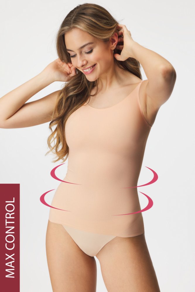 Stahovací tílko Sculpting se postará o lichotivě vytvarovanou postavu. Je ušité z hebkého mikrovlákna, které je na těle jako druhá kůže a díky hladké úpravě se neproznačí ani pod opravdu přiléhavým oblečením. MAX CONTROL – nejvyšší stupeň zeštíhlení Silikonový proužek na spodním okraji Lepené lemy Okraje řezané laserem Nevyztužené košíčky Bez kostic