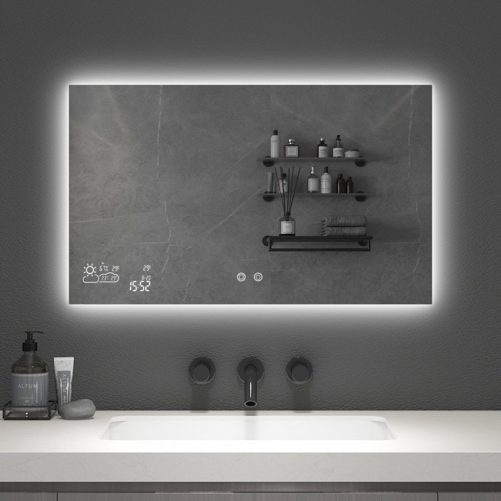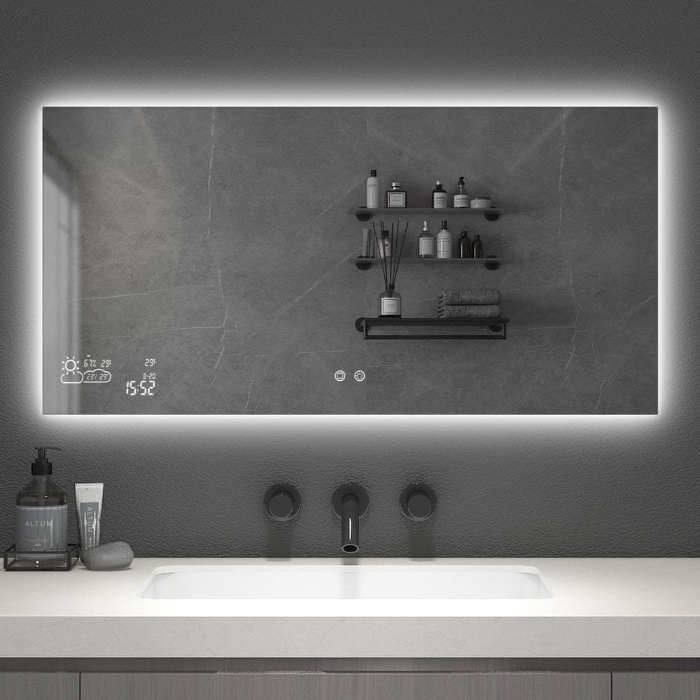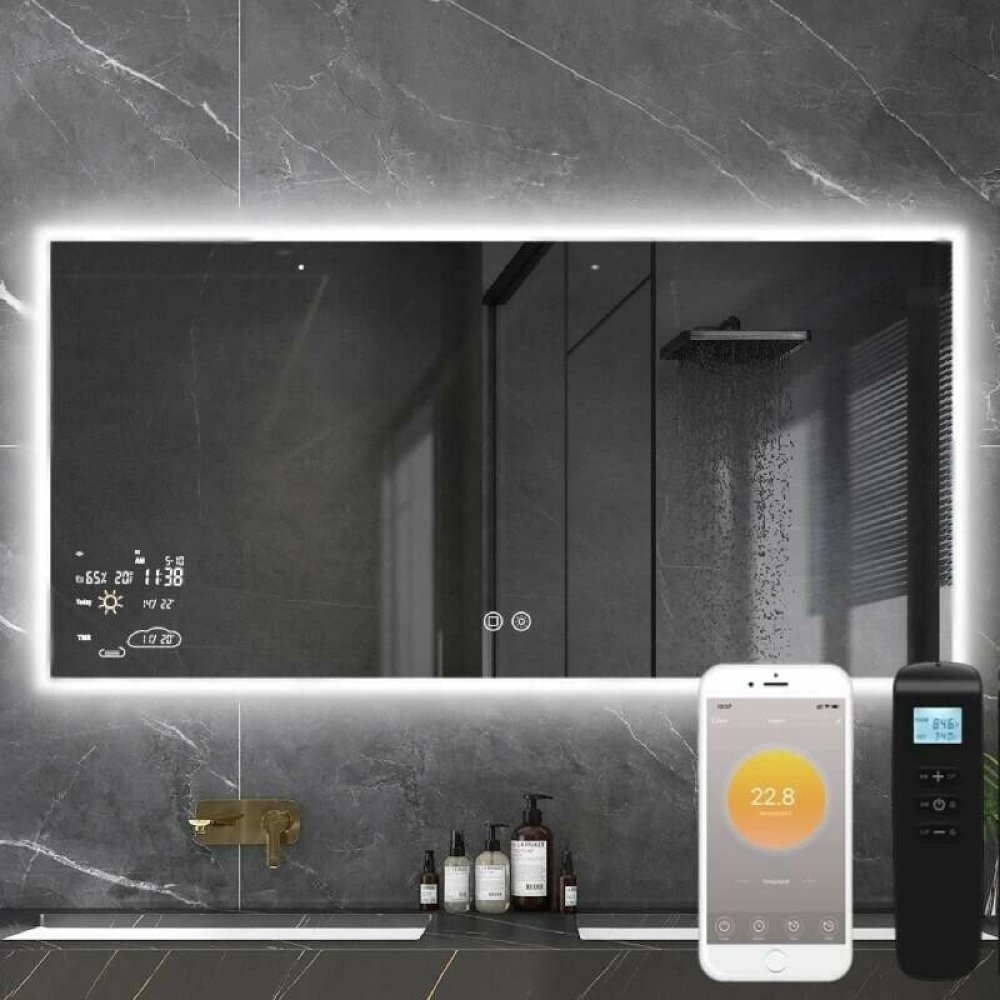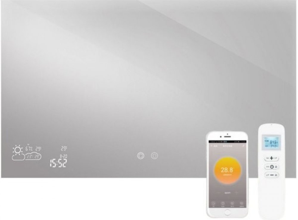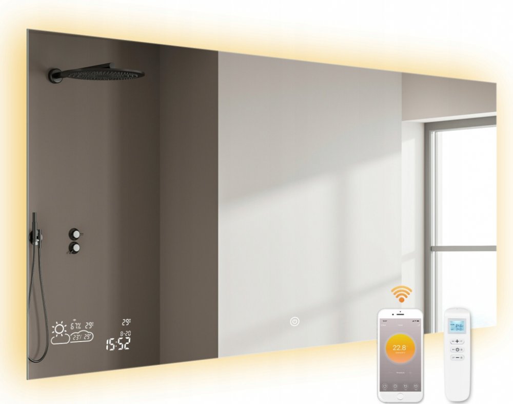 Smart Mirror 120x60 500W/15W LED dokáže ohřívat, odšumovat, osvětlovat, zobrazovat čas a datum, měřit vlhkost, zobrazovat a předpovídat počasí a samozřejmě plnit samostatnou funkci zrcadla. SMART funkce lze ovládat pomocí aplikace Wise mirror.