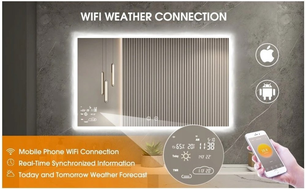- Multifunkční nastavení - po připojení k aplikaci WifiClock můžete nastavit 24hodinové / 12hodinové zobrazení, denní a měsíční režim, jednotku teploty ° C / ° F, zobrazení vlhkosti, nastavení alarmu ... být s naším chytrým zrcadlem.