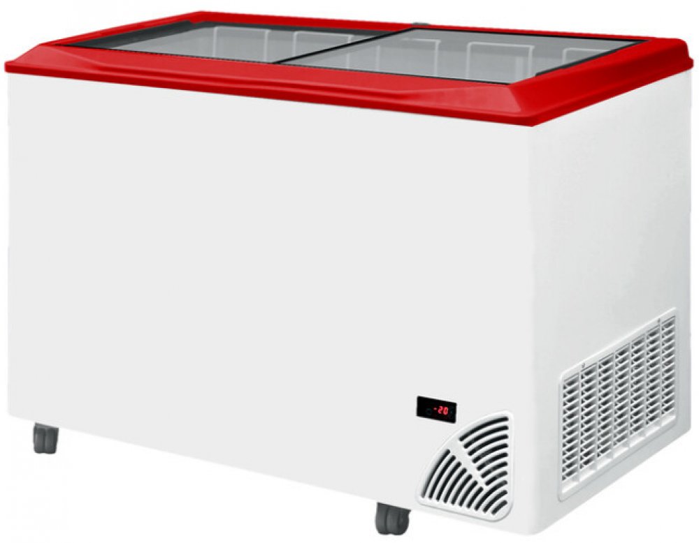 Pultová mraznička ARO 501/2 Red Edge s proskleným rovným víkem v provedení s bílým opláštěním, ALU vnitřek, má statické chlazení, vestavěný agregát a manuální odmrazování. Koše jsou součástí. Mraznička je vybavena digitálním termostatem s teploměrem, zámkem a kolečky. Rozměry 1264 x 713 x 875 mm, teplotní rozsah -22 až -18 °C.