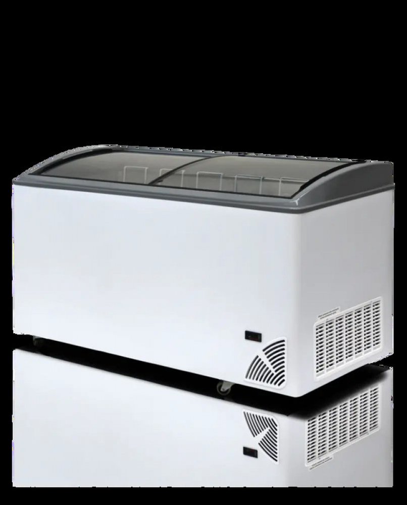 Prosklená víka: Mraznička je vybavena dvěma prosklenými posuvnými oblými víky z tvrzeného skla s termickou vrstvou, která zajišťuje lepší izolaci a umožňuje skvělou prezentaci produktů.