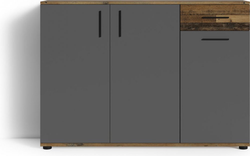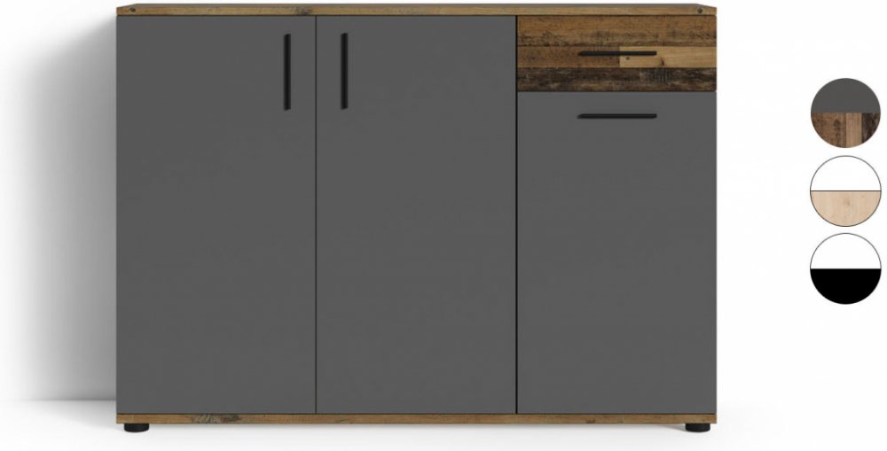 Komoda Jakob zaujme svým moderním a elegantním designem. Díky promyšleným rozměrům a uspořádání lze komodu použít také jako příborník, a proto ji lze použít v nejrůznějších místnostech. Ať už v šatně, kanceláři, obývacím pokoji nebo úložném prostoru, komoda Jakob vždy udělá dobrý dojem. Za třemi dvířky s policemi a zásuvkou můžete uložit spoustu věcí. Skříňka má robustní a odolný melaminový povrch...