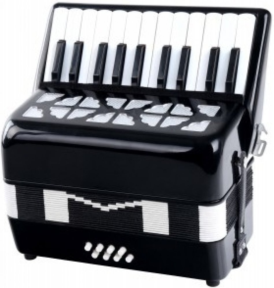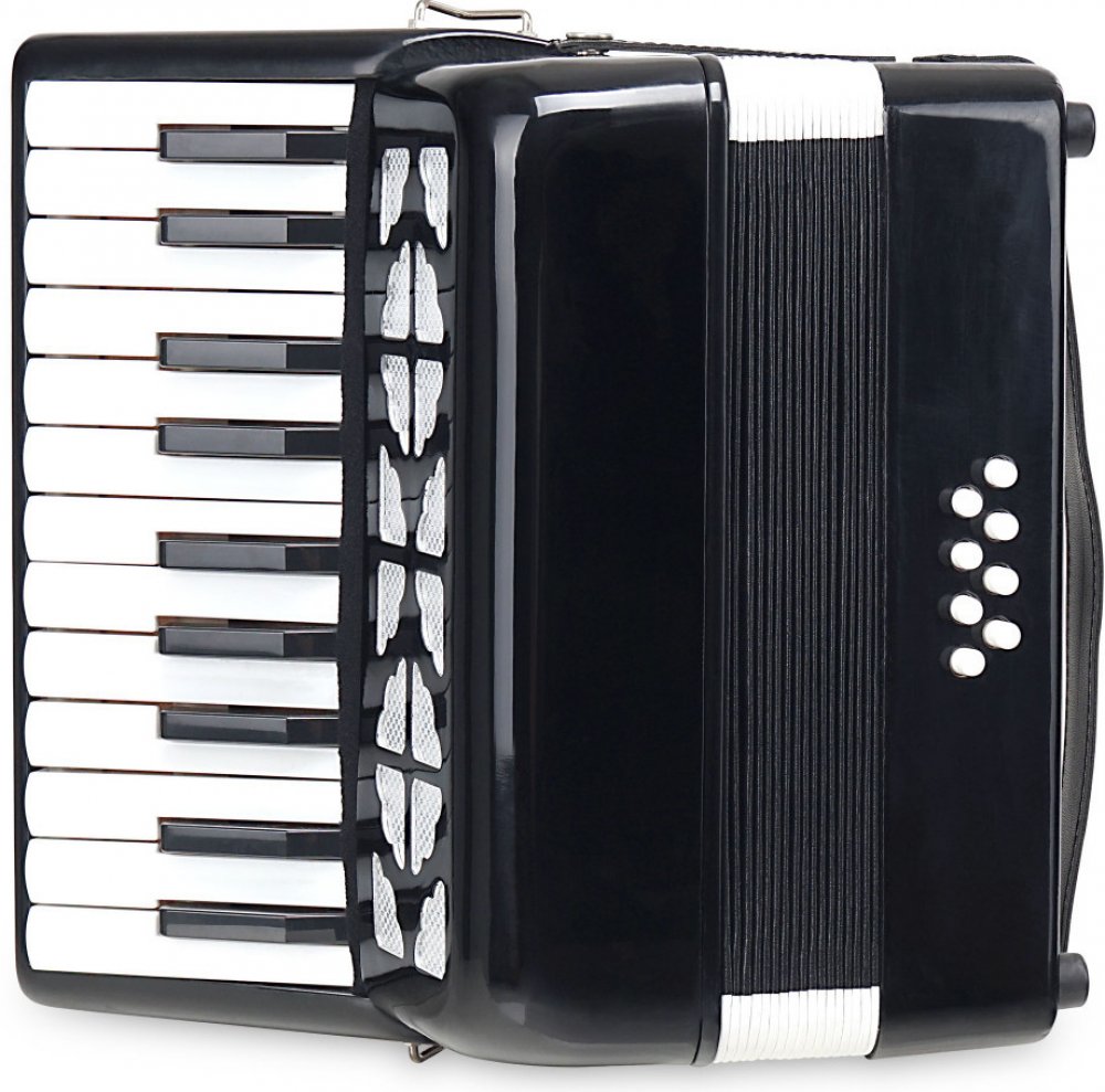Dětský akordeon s 22 klávesami a 8 basy v černém provedení s hmotností pouhých 2,4 kg.