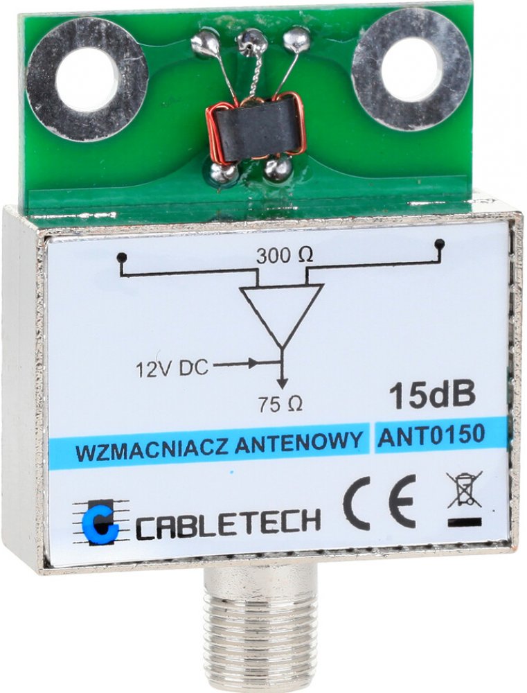 Štíněný anténní zesilovač 15dB pro síťové antény s F konektorem. Má certifikát CE. Určený pro vysílače vzdálené od místa příjmu 10-30 km.