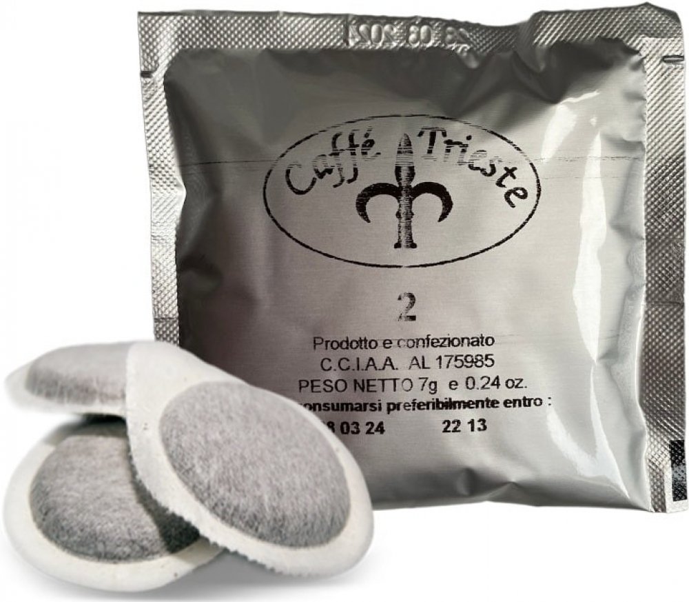 Kávový pod Caffé Trieste qualita BAR to je směs jižní a severní Itálie a obsahuje 7 typů kávových zrn různého původu. Je vyrobena ze směsi kávových zrn Arabica (75%) a kávy Robusta (25%).