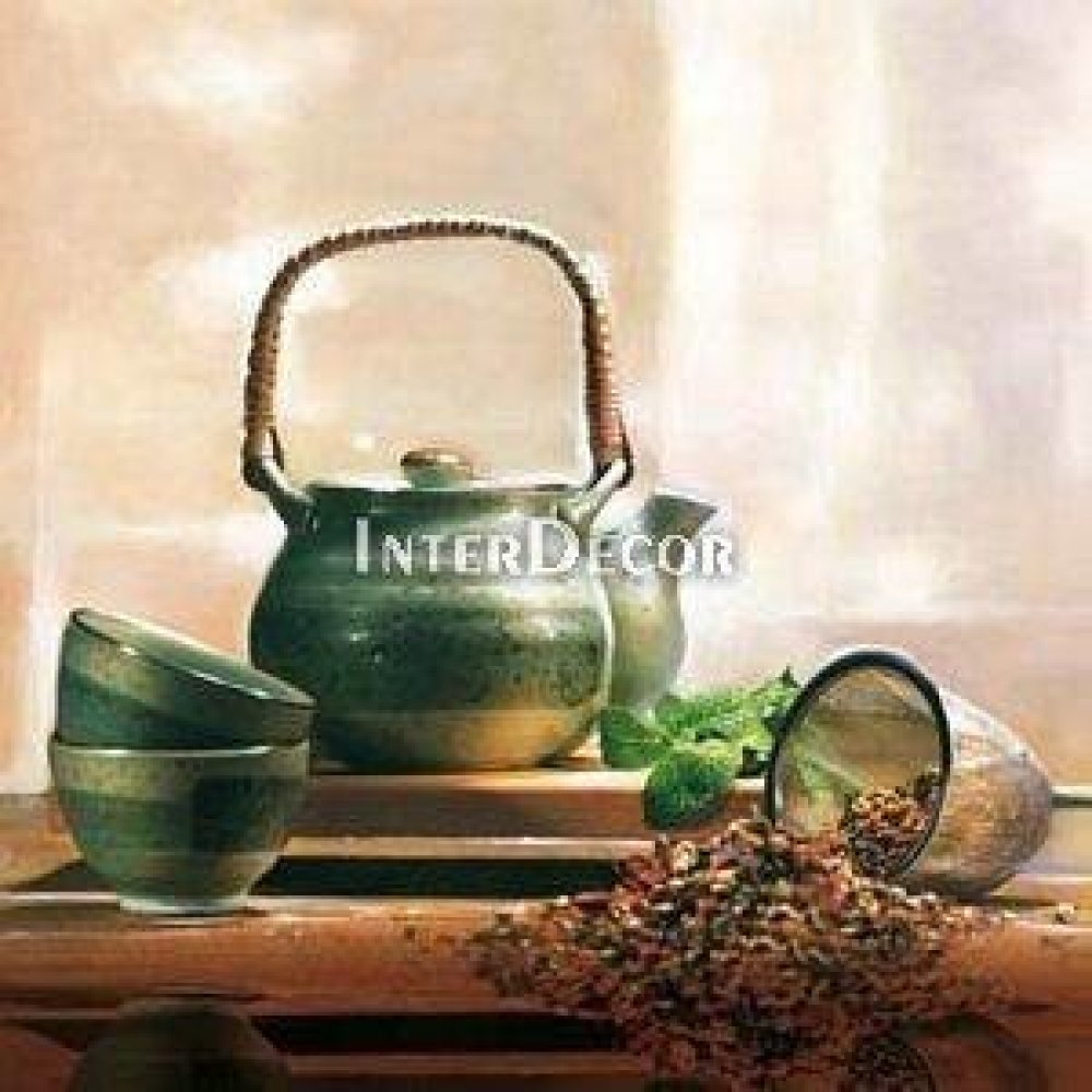 Obraz zátiší se zelenou čajovou konvicí a rozsypaným čajem. Motiv: čajová konvice, zátiší, čaj, zelená, dekorace