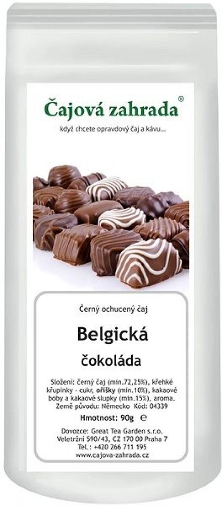 Čajová zahrada Belgická čokoládačerný, sypaný ochucený čaj, 500 g Čajová zahrada Belgická čokoláda"Čaj, který chutná jako dezert – sametový a smyslný." Sametově jemný a smyslný černý čaj, který chutná jako dezert. Naše směs Belgická čokoláda spojuje kvalitní černý čaj s kousky krokantu, kakaovými boby a kakaovými slupkami. V chuti připomíná luxusní belgické pralinky a nabízí intenzivní, přitom ele...