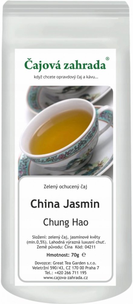 Jasmínový čaj Čajová zahrada - China Jasmin Chung Hao70 gJasmínový čaj Čajová zahrada - China Jasmin Chung Hao vás oslní svojí chutí. Tvořený je zeleným čajem, který je ochucený květy jasmínu. Nabízí zlatavý nálev, omamnou vůni a delikátní chuť. China Jasmin Chung HaoJasmínový čaj Čajová zahrada - China Jasmin Chung Hao si můžete vychutnat kdykoli v průběhu dne. Jednoduše se připravuje, stačí zal...
