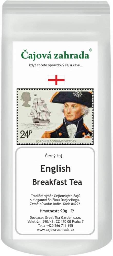 English Breakfast Tea je tradiční anglická čajová směs. Původně byla určená k vydatným snídaním o několika chodech, je velice oblíbená na celém světě. Pro své jemné karamelové aroma býval součástí směsi čínský čaj Čchi-men. Dnešní English Breakfast však z většiny obsahuje cejlonské a ásámské čaje, v poměru zhruba asi tři ku jedné. Často je pro zjemnění chuti přimícháno i určité množství čaje Darjeeling. Objevují se i směsi, v nichž jsou kromě cejlonských a ásámských obsaženy africké čaje. Příprava černého čaje Pro silnější nálev dáme jednu až dvě lžičky čajových lístků na čtvrt-litru vroucí vody. Louhujeme tři až pět minut. Mléko je přirozeným, ale není nutným, doplňkem tohoto řízného a aromatického čaje. Černý čaj jeho historie a zpracování Černý čaj (občas také zvaný červený čaj) - přestože tyto plně fermentované čaje nejsou v Číně příliš oblíbeny, jejich hlavní druhy jsou mistrovskými díly. I levnější sorty nás příjemně překvapí pěkným vzhledem, svědčícím o dokonale provedené sklizni a zpracování čaje. Některé čaje z této skupiny se vyrábějí pouhých padesát let (např. čaj Yunnan) zatímco jiné jsou známy od 17. století. Nicméně je nutno předpokládat, že tento typ čaje je Číňanům znám přinejmenším stejně dlouho jako vícenásobně fermentované čaje typu Pu Erh, (tj. zhruba od 7. století n. l.), ale patrně jim příliš nelahodil. Černý čaj je, jak již bylo zmíněno, fermentovaný a oolong je polo-fermentovaný. Po sklizni se listy nechají „zvadnout“, tedy částečně usušit, a to podle stylu buď na slunci, nebo ve stínu. Pokud lístky nejsou částečně vysušeny, nelze je svinout. Enzymatické procesy probíhají pravé během tohoto vadnutí. Nejlepší čaje jsou proto ty, u kterých vadnutí proběhne díky suchému počasí během několika hodin. „Deštivé čaje“, které vadnou pomaleji, nejsou tak oblíbené. Když jsou svinuty, jsou čajové lístky rozprostřeny na vlhkém a studeném místě k fermentaci, tedy k další oxidaci. Účinky obou fází oxidace se od sebe výrazně liší. Patrně proto, že po svinutí jsou oxidaci vystaveny i další složky listů, například esenciální oleje. Právě proto nesmí být lístky určené k výrobě černého čaje či oolongu před svinutím "usmrceny", jako je tomu v případě lístků určených pro čaj zelený. Složení a popis čaje - Ingredients and description of Tea English Finest English Breakfast Tea Traditional blend of Ceylon and Darjeeling broken teas with an elegant, strong cup. The perfect tea for everybody’s breakfast. It can be enjoyed with milk and sugar also. Italiono Finest English Breakfast Tea Miscela tradizionale di tè Broken Darjeeling e Ceylon con un infuso forte e speziato. La bevanda ideale per la colazione, adatto anche con latte e candies (zucchero cristallizzato). Deutsch Finest English Breakfast Tea Traditionelle Mischung aus Darjeeling- und Ceylon-Broken-Tees mit einer starken, würzigen Tasse. Optimal als Begleiter für das Frühstück, gern auch mit Milch und Kandis getrunken. Français Finest English Breakfast Tea Un mélange traditionnel de thés Broken de Darjeeling et de Ceylan avec une tasse fortement épicée. Optimal pour accompagner le petit déjeuner, également volontiers bu avec du lait et du sucre candi.