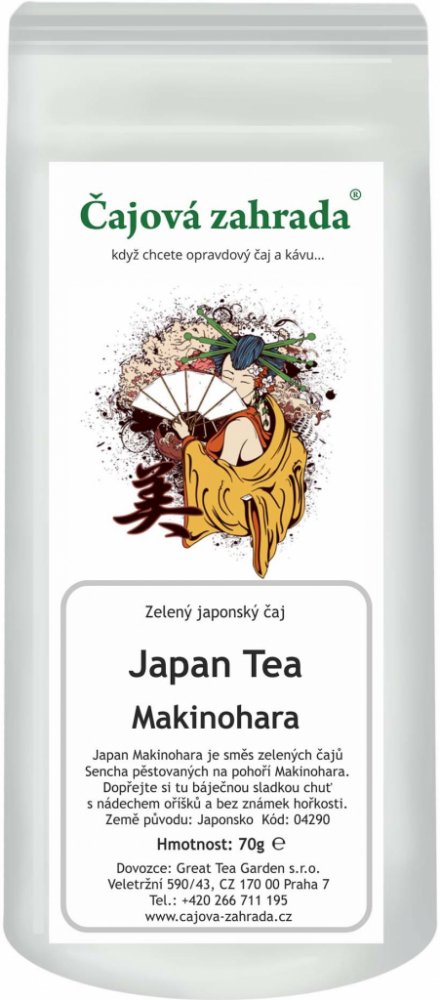 Zelený čaj Čajová zahrada - Japan Makinohar70 gZelený čaj Čajová zahrada - Japan Makinohar vás oslní svojí chutí. Tvořený je směsí zelených čajů Sencha pěstovaných na pohoří Makinohara v Japonsku. Japan MakinoharZelený čaj Čajová zahrada - Japan Makinohar nabízí sladkou chuť s nádechem oříšků. Můžete si ho vychutnat kdykoli v průběhu dne. Jednoduše se připravuje, stačí zalít vodou o teplotě 85 °C a nechat 2-3 minut louhovat. Klíčové vlastnosti zeleného čaje Čajová zahrada - Japan MakinoharaZelený čaj s lahodnou chutíTvořený je směsí zelených čajů Sencha pěstovaných na pohoří Makinohara v JaponskuNabízí sladkou chuť s nádechem oříškůZelený čaj Čajová zahrada se jednoduše připravujeVýživové hodnoty na 100 g Energetická hodnota 4 Kj / 1 Kcal Tuky