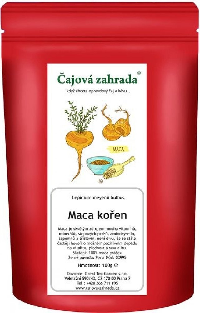 Maca kořen prášek 100g Čajová zahrada Zatímco většina rostlin rozhodně nevyhledává chladné a větrné vysokohorské podnebí, maca peruánská je přímo miluje. A jelikož je skvělým zdrojem mnoha vitamínů, minerálů, stopových prvků, aminokyselin, saponinů a tříslovin, není divu, že se stále častěji hovoří o možném pozitivním dopadu na vitalitu, plodnost, sexualitu i hormonální zdraví. Podle archeologických nálezů tuto rostlinu používali obyvatelé And už před 1500 lety – a díky nám si ji můžete dopřát i dnes.Hmotnost: 100g e Složení: Maca kořen prášek 03995