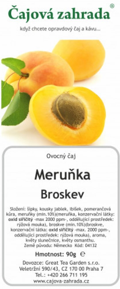 Čajová zahrada - Meruňka & BroskevOvocný čaj, 90 g Čajová zahrada - Meruňka & BroskevOvocný čaj Čajová zahrada - Meruňka & Broskev vás oslní svojí chutí. Obsahuje šípky, kousky jablek, meruněk a broskví, ibišek, pomerančovou kůru, slunečnice i květy osmanthu. Ovoce je sušeno mrazem, díky čemuž si zachovává čerstvost a vitamíny. Ovocný čaj Čajová zahrada - Meruňka & Broskev si můžete vychutnat kdyk...