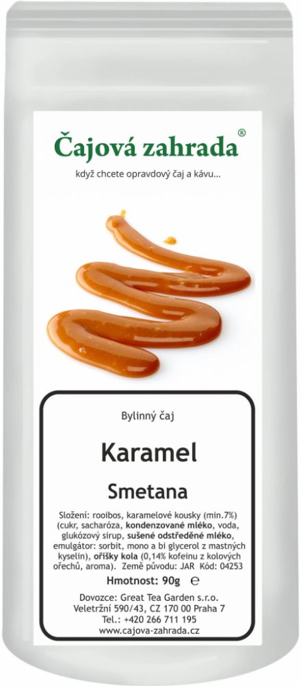 Složení: rooibos, karamelové kousky (min.7%) (cukr, sacharóza, kondenzované mléko, voda, glukózový sirup, sušené odstředěné mléko, emulgátor: sorbit, mono a bi glycerol z mastných kyselin), aroma, oříšky kola (0,14% kofeinu z kolových ořechů). Nebesky krémová karamelová chuť.