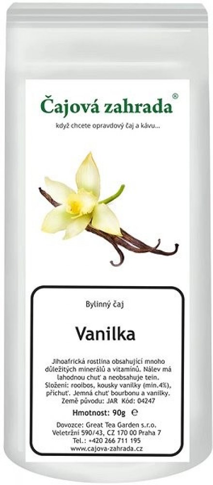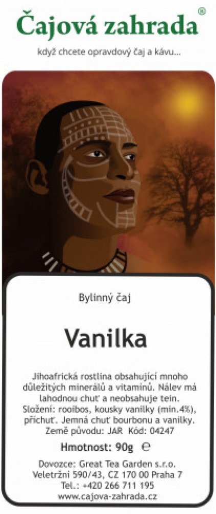 Rooibos čaj Je to vytrvalá rostlina s jemně jehličkovitými listy, dorůstající výšky 1 metru. Původem z cedarbergské oblasti v západo-kapské části Jižní Afriky. Předmětem použití je nať, sbíraná odřezáváním asi 35cm nad zemí (Herba aspalathi - Rooibos). Čaj se fermentuje, podobně jako černý čaj (nebo červený). Čaj Rooibos obsahuje kvalitní třísloviny (4,5 až 6% proti 8 až 15% v černém čaji) a velké množství stopových prvků a minerálů - železo, měď, zinek, hořčík, mangan, draslík, vápník, fluor, molybden a další. Dále nacházíme látku zvláštní chemické povahy, zvanou aspalathin, velké množství flavonoidů, organické kyseliny, vitamin C a řadu jiných látek, jejichž výzkumy pokračujou. Rooibos je svou působností na rozmezí mezi produkty potravinářskými a léčivými. Nejsou známy žádné kontraindikace ani vážnější nežádoucí účinky po jejím podání. Proto je vhodná i pro děti, těhotné a kojící ženy. Neobsahuje kofein ani jeho deriváty. Historie Rooibosu Historie čajovníkovce Rooibos začíná rokem 1804, kdy Žid Benjamin Ginsberg přesvědčil kapské Búry, aby sbírali nať divoce rostoucích bylin. Později je začali pěstovat. Původní "technologie" sběru, sušení a přípravy čajovníku pochází od jihoafrických domorodců, zřejmě přímo od Masajů. První sklizeň se provádí druhým rokem. Čajová surovina je po sběru podrobena fermentaci a poté je pasterizována. Čaj je oblíben v USA, Německu, Švýcarsku a v poslední době pronikl dokonce také do Japonska. Složení a popis čaje - Ingredients and description of Tea English Vanille Ingredients: Rooibos, vanilla pieces, flavour. Fine bourbon vanilla- taste. Italiono Vaniglia Ingredienti: Rooibos, pezzi di vaniglia, aroma. Aroma raffinato di vaniglia bourbon. Deutsch Vanille Zutaten: Rooibos, Vanillestücke, Aroma. Feiner Bourbon-Vanille- Geschmack. Français Vanille Ingrédients: Rooibos, morceaux de vanille, arôme. Goût de bourbon fin et de vanille. Příprava Roibosu - z plantáže až do Vašeho šálku