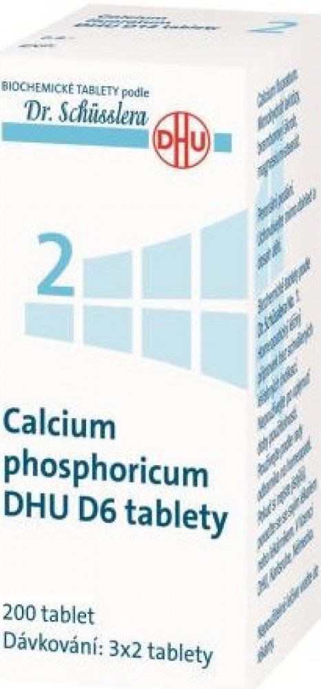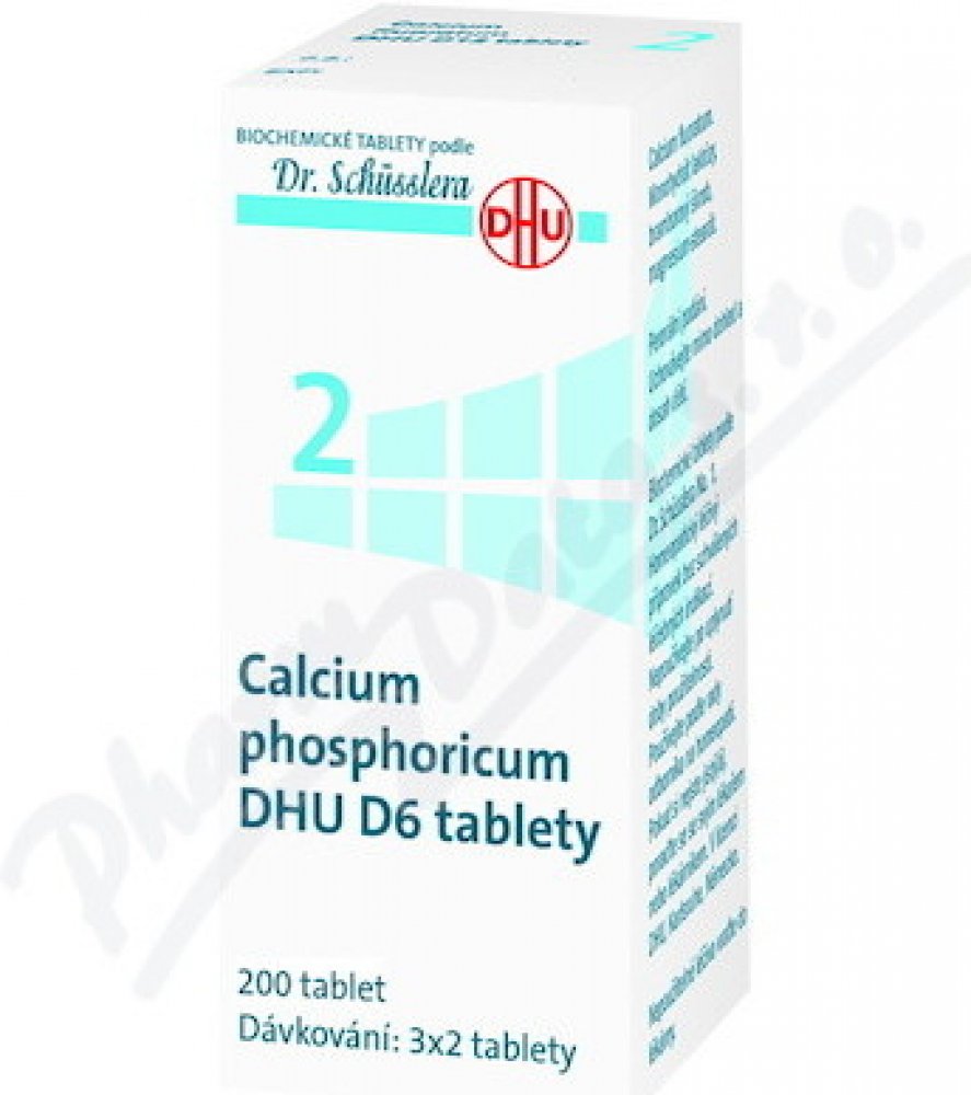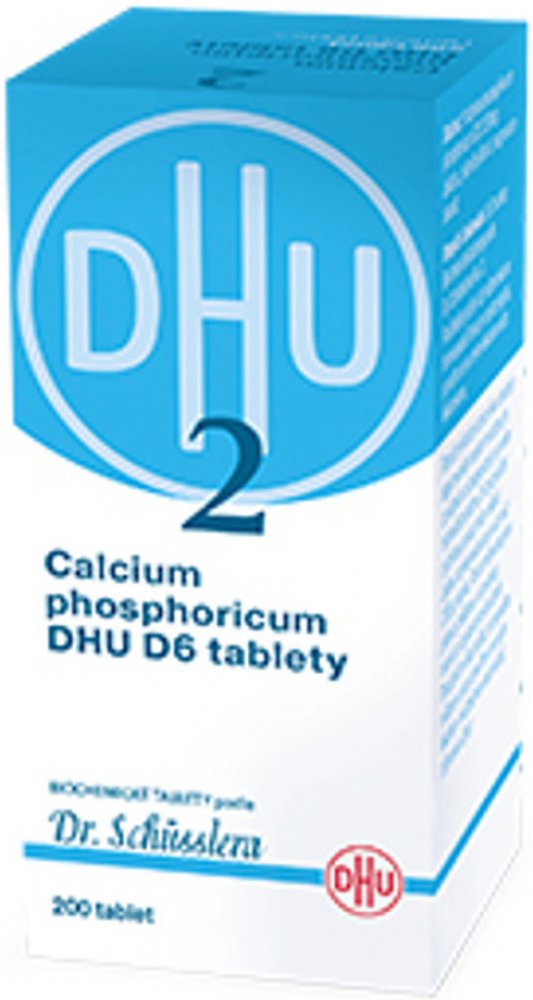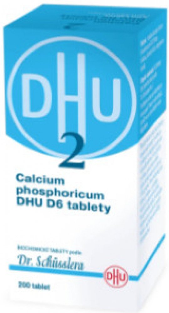 Calcium phosphoricum DHU je homeopatický léčivý přípravek bez schválených léčebných indikací. Biochemické tablety podle Dr. Schüsslera No. 2. Tzv. Schüsslerovy soli. Používejte podle rady odborníka na homeopatii.