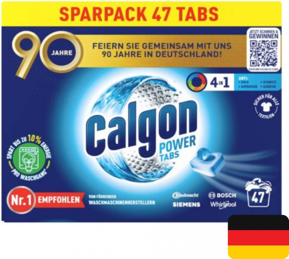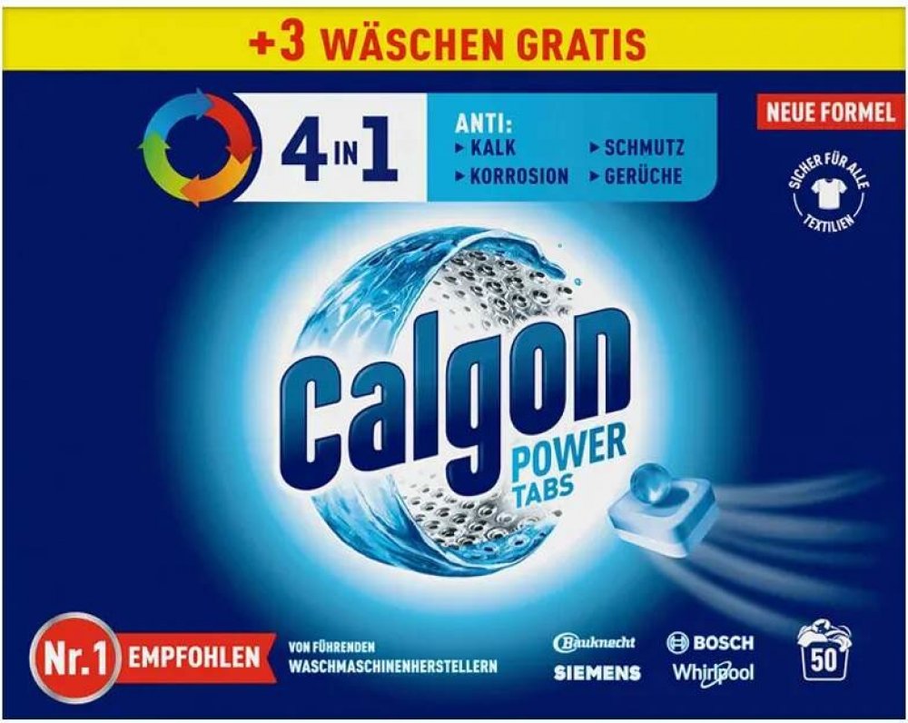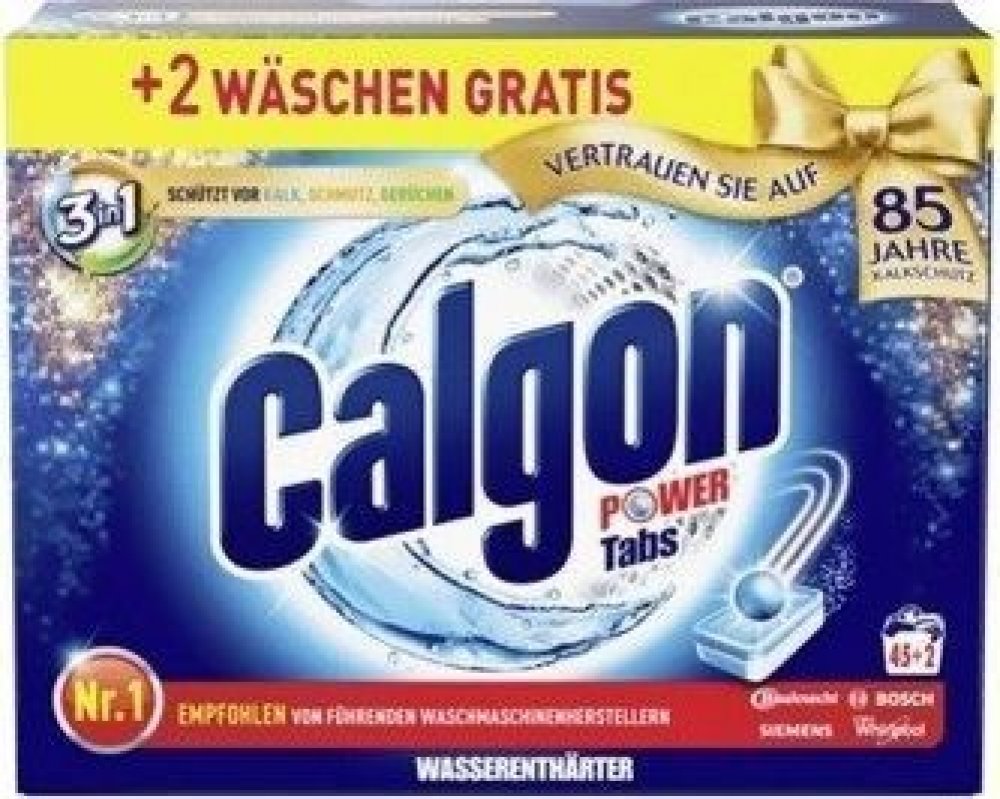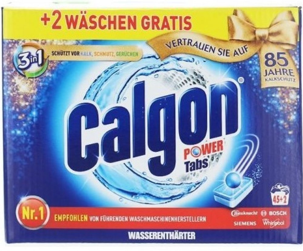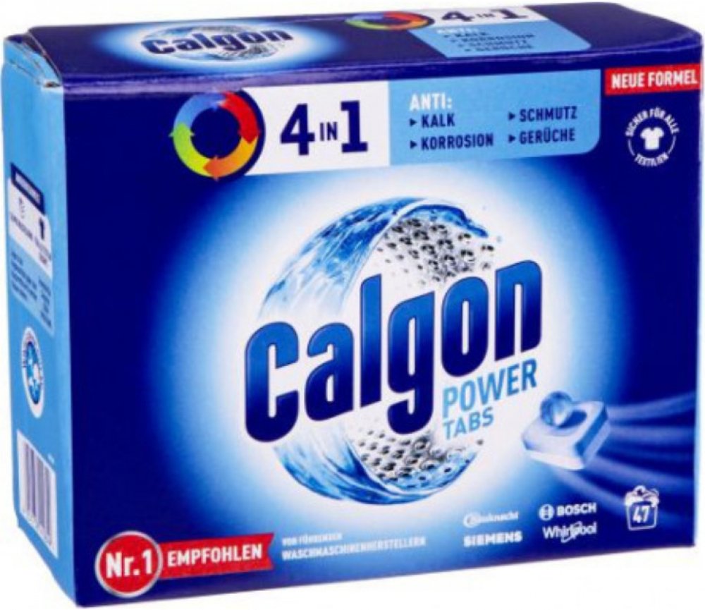 Calgon tablety proti vodnímu kameni 47 ks Power 4v1 mají čtyři účinky: 1) Komplexní ochranu před vodním kamenem. Calgon díky svému neutralizačnímu účinku chrání všechny důležité části vaší pračky. 2) Čistící účinek pomáhá předcházet usazování nečistot a zbytků pracích prostředků uvnitř pračky. Calgon tyto usazeniny neutralizuje, pomáhá k jejich odplavení a udržuje tak vaši pračku čistou. 3) Chrání Vaši pračku před korozí. 4) Provoní pračku svěží vůní.POUŽITÍ:Umístěte tabletu do příhádky na prací prostředek. Používejte při každém praní. Prací prostředek dávkujte podle doporučeného dávkování pro praní v měkké vodě. Vhodné pro všechny textilie.SLOŽENÍ:15-30% Polycarboxylate, <5% Duftstoffe.UPOZORNĚNÍ:VAROVÁNÍ. Uchovávejte mimo dosah dětí. Reakce: PŘI ZASAŽENÍ OČÍ: Několik minut opatrně vyplachujte vodou. Vyjměte kontaktní čočky, jsou-li nasazeny a pokud je lze vyjmout snadno. Pokračujte ve vyplachování. PŘI POŽITÍ: Necítíte-li se dobře, volejte TOXIKOLOGICKÉ INFORMAČNÍ STŘEDISKO nebo lékaře. Je-li nutná lékařská pomoc, mějte po ruce obal nebo štítek výrobku. Při styku s kůží omyjte důkladně vodou a mýdlem. Při vdechnutí prachu odveďte postiženého na čerstvý vzduch.ŽIVOTNÍ PROSTŘEDÍ:Zcela prázdný a čistý obal je možné recyklovat. Chraňte životní prostředí recyklací. Má to smysl.