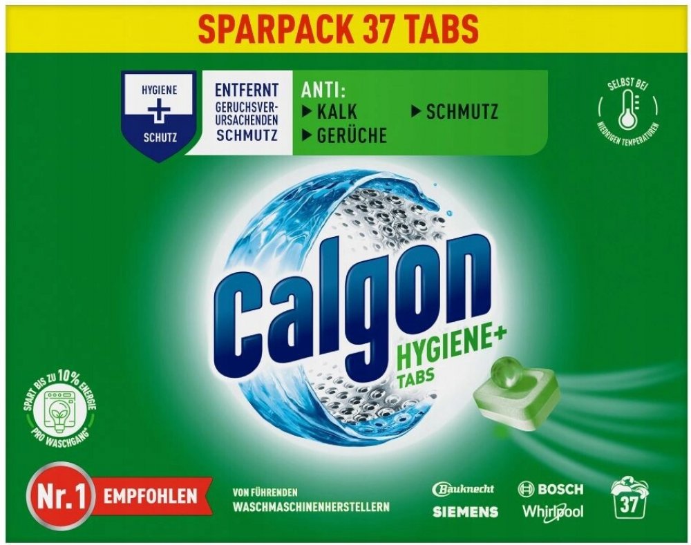 - Calgon Hygienie + odstraňuje zbytky z tkanin a nečistot při každém praní, s nímž byly použity
