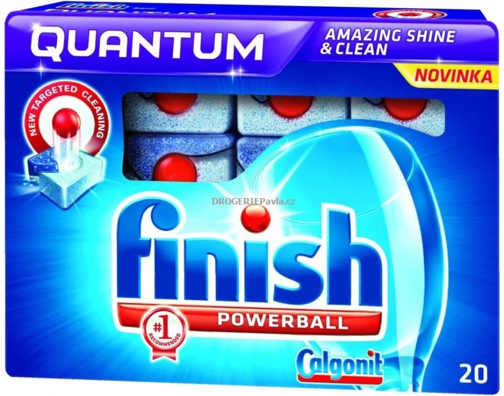 Tablety Finish Quantum má tři komory, každá má svou specifickou funkci. Pro zářivý lesk tablety obsahují Powerball Gel, který se při mytí uvolňuje a působí na nádobí. Pro změkčení a odstranění i nesilnější nečistoty obsahují unikátní mikročástice a nakonec díky vysoce účinnému detergentu je nádobí zbavené mastnoty. Tablety také účinně odstranují nežádoucí zápach z myčky po umytí.