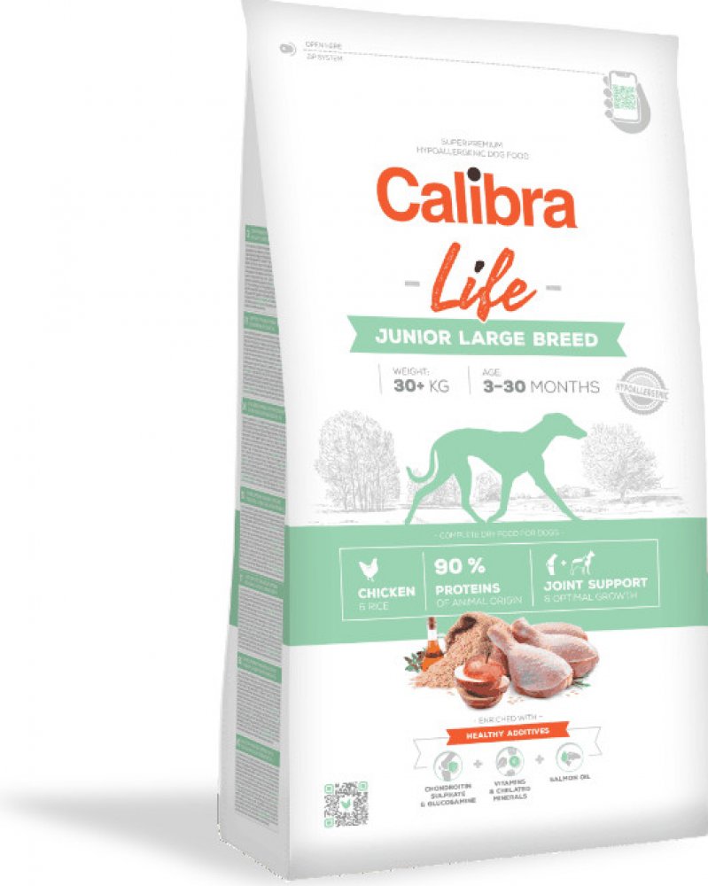 Calibra Dog Life Junior Large Breed Chicken je receptura krmiva pro mladé psy (3–30 měsíců) velkých plemen (nad 30 kg) s kuřecím masem. Obsahem bílkovin živočišného původu ve výši 90 % z celkového obsahu bílkovin vyhovují i nejnáročnějším požadavkům na výživu těchto velkých psů. Receptura je sestavena jako monoproteinová - pouze jeden zdroj živočišných bílkovin. Kompletní krmivo je zároveň hypoalergenní a kvalitní kuřecí maso je kombinováno s rýží. Vysoká výživová hodnota krmiva je doplněna o kloubní výživu, která pomáhá předcházet problémům pohybového aparátu velkých psů v dospělosti. Vitaminy a minerály pomáhají dospívajícím psům v péči o celkové zdraví a imunitu. Zdravou kůži a srst navíc podpoří lososový olej. Funkce hlavních aditiv - chondroprotektiva - (chondroitin sulfát a glukosamin) – vyživují chrupavku a zpomalují proces jejího opotřebení. - vitaminy a chelátové minerály (vysoce využitelná organická forma minerálů) – pro správnou funkci organismu, prevenci onemocnění a posílení imunitního systému. - lososový olej - zdroj nenasycených mastných kyselin omega-3 (EPA, DHA) potřebných pro podporu fyziologické funkce kůže a srsti a jejich kvality. Mají také protizánětlivý účinek. Složení: kuřecí bílkoviny (45 %), rýže (22 %), drůbeží tuk (10 %, konzervováno tokoferoly), pivovarská rýže (7 %), hydrolyzované drůbeží bílkoviny (5 %), sušená jablečná dužina (4 %), kvasnice, hydrolyzovaná kuřecí játra (2 %), lososový olej (2 %), prebiotika (mannan-oligosacharidy 150 mg/kg, β-glukany 120 mg/kg, frukto-oligosacharidy 100 mg/kg), glukosamin (300 mg/kg), sušený rozmarýn a tymián (250 mg/kg), chondroitin sulfát (200 mg/kg), Yucca schidigera (100 mg/kg), Lactobacillus acidophilus HA – 122 inaktivovaný (15 × 109 buněk/kg). Analytické složky: hrubý protein 28 % hrubý tuk 16 % hrubá vláknina 2,8 % hrubý popel 6,2 % vlhkost 9 % vápník 1,4 % fosfor 1 % sodík 0,4 % hořčík 0,1 % omega-3 mastné kyseliny 0,3 % omega-6 mastné kyseliny 2 % bílkoviny živočišného původu z celkového obsahu bílkovin 90 % Nutriční aditiva v 1 kg: vitamin A (3a672a) 20 000 IU vitamin D3 (E671) 1 750 IU vitamin E (3a700) 400 mg vitamin C (3a312) 300 mg vitamin B1 (3a820) 6 mg vitamin B2 8 mg niacinamid (3a315) 30 mg pantothenát vápenatý (3a841) 15 mg vitamin B6 (3a831) 6 mg kyselina listová (3a316) 0,8 mg vitamin B12 0,06 mg biotin (3a880) 0,8 mg cholin chlorid (3a890) 2?000 mg organický zinek (3b606) 120 mg organické železo (3b106) 90 mg organický hořčík (3b504) 40 mg organická měď (3b406) 16 mg jód (3b201) 0,8 mg organický selen (3b810) 0,2 mg Obsahuje přírodní antioxidanty schválené EU: tokoferolové extrakty z rostlinného oleje (1b306), askorbyl palmitát (1b304) a extrakt z rozmarýnu. Metabolizovatelná energie: 3 870 kcal/kg Krmný návod: