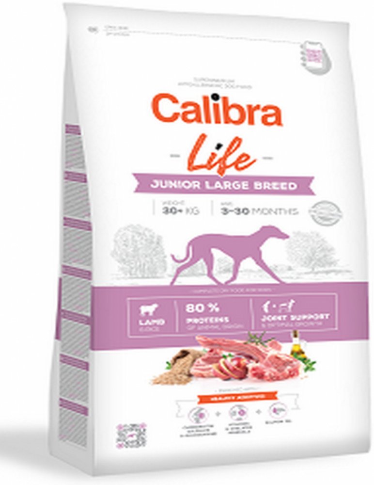 Calibra Dog Life Junior Large Breed Lamb jsou granule pro mladé psy (3–30 měsíců) velkých plemen (nad 30 kg) s jehněčím masem. Vyznačují se vysokou stravitelností, jsou hypoalergenní, velikost granulí je přizpůsobena fyziologickým potřebám velkých psů. Kvalitní proteiny, které jsou z 80 % živočišného původu, dodají dospívajícímu psovi potřebnou energii a dostatek živin pro jeho růst a vývoj. Receptura je sestavena jako monoproteinová - pouze jeden zdroj živočišných bílkovin. Jsou obsažena chondroprotektiva, která pomáhají pečovat o kloubní chrupavku namáhaných kloubů velkých plemen, a předchází tím problémům s klouby v dospělosti. Vitaminy a minerály přispívají k celkovému zdraví a posílení imunity. Lososový olej pomáhá pečovat o zdraví kůže a zářivou srst. Funkce hlavních aditiv - chondroprotektiva - (chondroitin sulfát a glukosamin) – vyživují chrupavku a zpomalují proces jejího opotřebení. - vitaminy a chelátové minerály (vysoce využitelná organická forma minerálů) – pro správnou funkci organismu, prevenci onemocnění a posílení imunitního systému. - lososový olej - zdroj nenasycených mastných kyselin omega-3 (EPA, DHA) potřebných pro podporu fyziologické funkce kůže a srsti a jejich kvality. Mají také protizánětlivý účinek. Složení: jehněčí bílkoviny (40 %), rýže (30 %), drůbeží tuk (9 %, konzervováno tokoferoly), pivovarská rýže (9 %), sušená jablečná dužina (4 %), kvasnice, hydrolyzovaná kuřecí játra (2 %), lososový olej(2 %), prebiotika (mannan-oligosacharidy 150 mg/kg, ß-glukany 120 mg/kg, frukto-oligosacharidy 100 mg/kg), glukosamin (300 mg/kg), sušený rozmarýn a tymián (250 mg/kg), chondroitin sulfát (200 mg/kg), Yucca schidigera (100 mg/kg), Lactobacillus acidophilus HA – 122 inaktivovaný (15 × 109 buněk/kg). Analytické složky: hrubý protein 28 % hrubý tuk 15 % hrubá vláknina 3 % hrubý popel 5,8 % vlhkost 9 % vápník 1,3 % fosfor 1 % sodík 0,4 % hořčík 0,1 % omega-3 mastné kyseliny 0,4 % omega-6 mastné kyseliny 1,7 % bílkoviny živočišného původu z celkového obsahu bílkovin 80 % Nutriční aditiva v 1 kg: vitamin A (3a672a) 20 000 IU vitamin D3 (E671) 1 750 IU vitamin E (3a700) 400 mg vitamin C (3a312) 300 mg vitamin B1 (3a820) 6 mg vitamin B2 8 mg niacinamid (3a315) 30 mg pantothenát vápenatý (3a841) 15 mg vitamin B6 (3a831) 6 mg kyselina listová (3a316) 0,8 mg vitamin B12 0,06 mg biotin (3a880) 0,8 mg cholin chlorid (3a890) 2?000 mg organický zinek (3b606) 120 mg organické železo (3b106) 90 mg organický hořčík (3b504) 40 mg organická měď (3b406) 16 mg jód (3b201) 0,8 mg organický selen (3b810) 0,2 mg Obsahuje přírodní antioxidanty schválené EU: tokoferolové extrakty z rostlinného oleje (1b306), askorbyl palmitát (1b304) a extrakt z rozmarýnu. Metabolizovatelná energie: 3 825 kcal/kg Krmný návod: