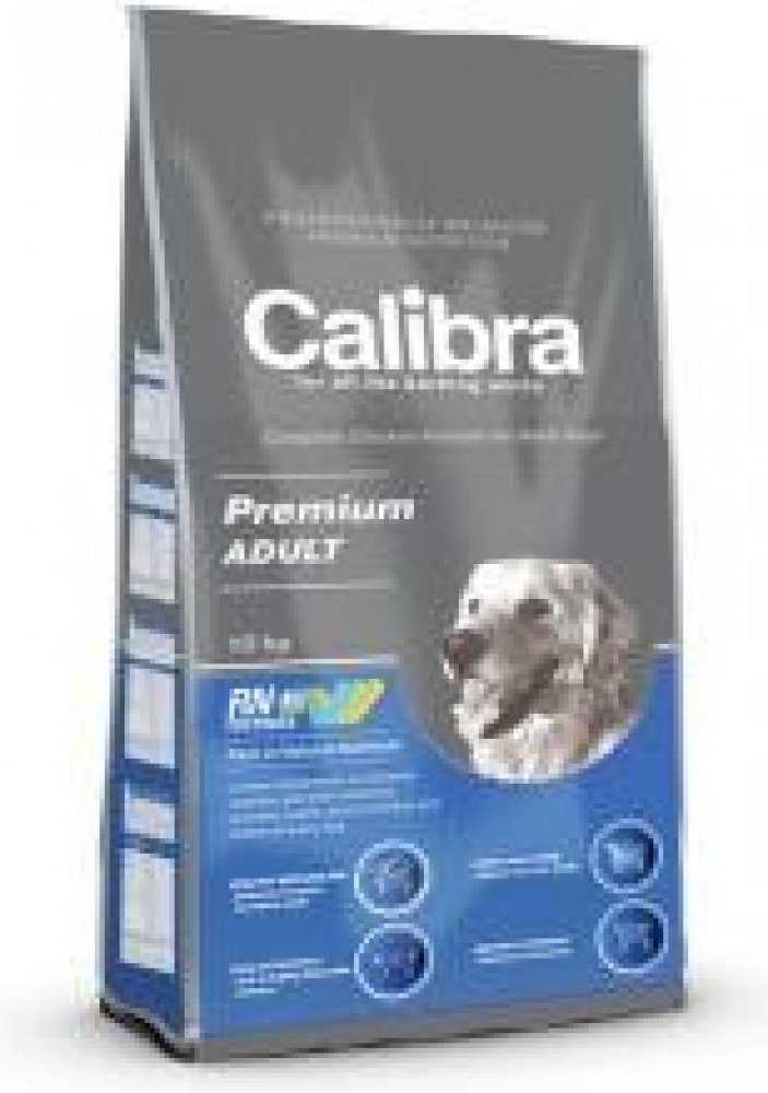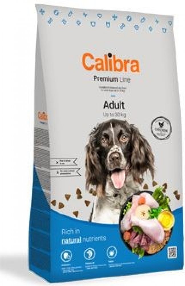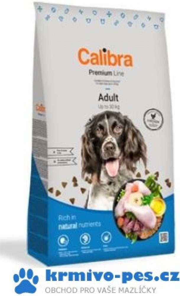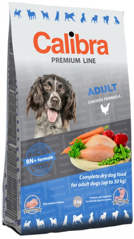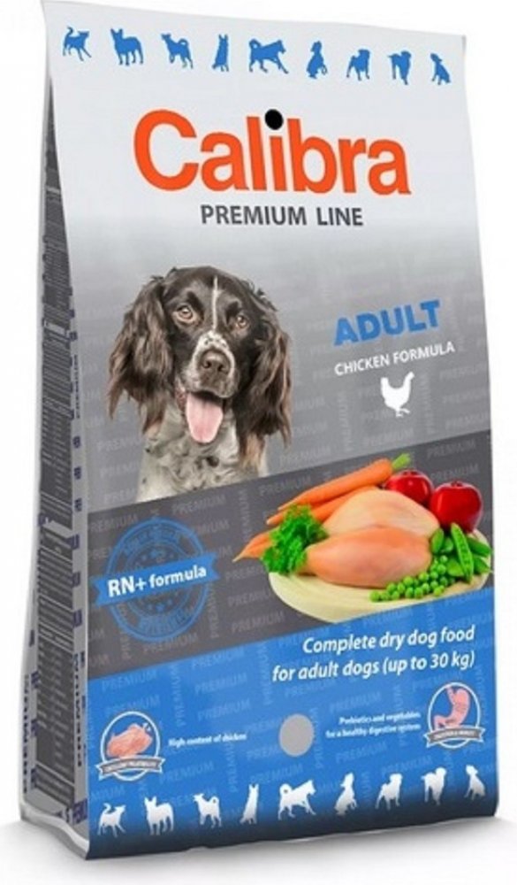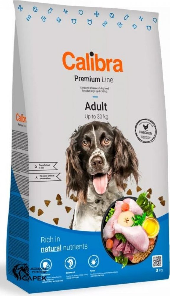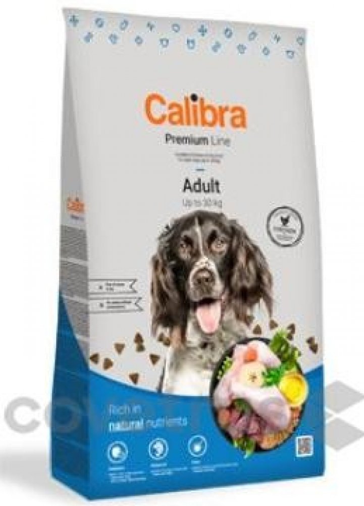 Calibra Dog Premium Adult je kuřecí receptura pro dospělé psy do 30 kg.Jedná se o vysoce kvalitní kompletní suché krmivo pro všechny psí mazlíčky. Nabízí vyvážený poměr všech potřebných živin, vitamínů, minerálů či stopových prvků tak, aby plně zabezpečily všechny výživové nároky zdravého pejska.Tato monoproteinová kuřecí receptura bez pšenice a pšeničného lepku se vyznačuje výbornou stravitelností.Proteiny živočišného původu jsou v celkové výši 75 %. Aditiva na míruPrebiotika - mannan-oligosacharidy (MOS) a frukto-oligosacharidy (FOS) podporují střevní mikroflóru, správnou funkci trávicího traktu a posilují imunitní systém. Betaglukany stimulují a posilují imunitní systém.Olej z lososa - zdroj nenasycených omega 3 mastných kyselin (EPA, DHA), které jsou potřeba pro vývoj a funkci mozku, podporu fyziologické funkce kůže a srsti a jejich kvality. Mají také protizánětlivý účinek.Yucca schidigera má detoxikační účinky. Obsahuje chlorofyl, stopové prvky, vitamíny, saponiny a polyfenoly. Působí pozitivně na trávicí trakt, snižuje plynatost a zápach exkrementů. Receptura je bez: pšenice, pšeničného lepku, sóji, přidaných barviv a umělých konzervantů, geneticky modifikovaných surovin Složení: kuřecí protein 35 %, kukuřice, oves 16 %, drůbeží tuk 5 %, sušená jablečná dužina 3 %, pivovarské kvasnice, hydrolyzovaná kuřecí játra 2 %, lososový olej 1 %, mrkev 1 %, hrášek 1 %, sušená petržel 0,5 %, sušené chaluhy 0,4 % (kelpa, Ascophyllum nodosum), glukosamin (260 mg/kg), chondroitin sulfát (160 mg/kg), mannan-oligosacharidy (150 mg/kg), frukto-oligosacharidy (80 mg/kg), Yucca schidigera (80 mg/kg), ß-glukany (40 mg/kg). Analytické složky: