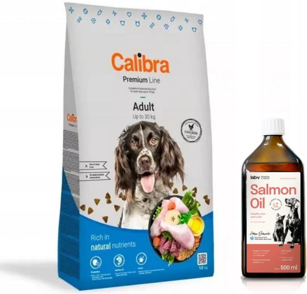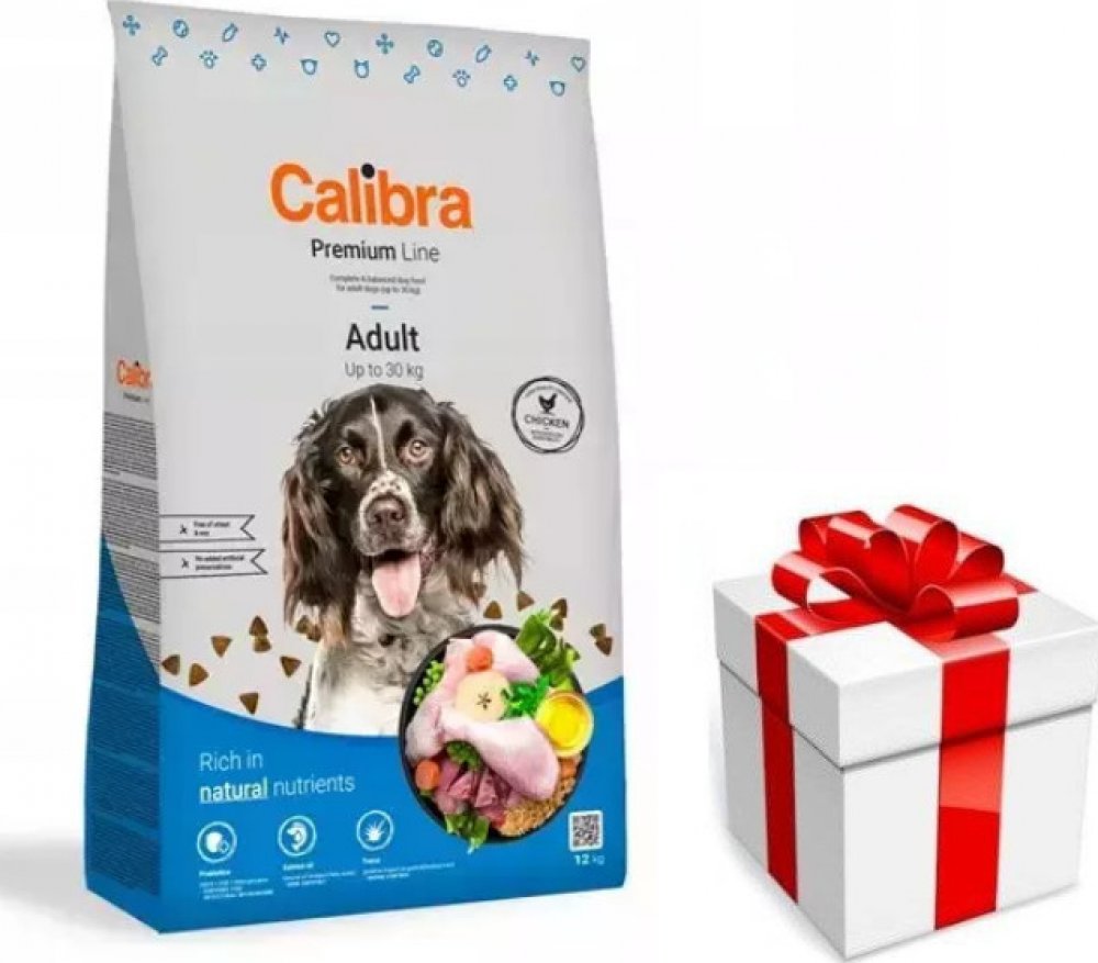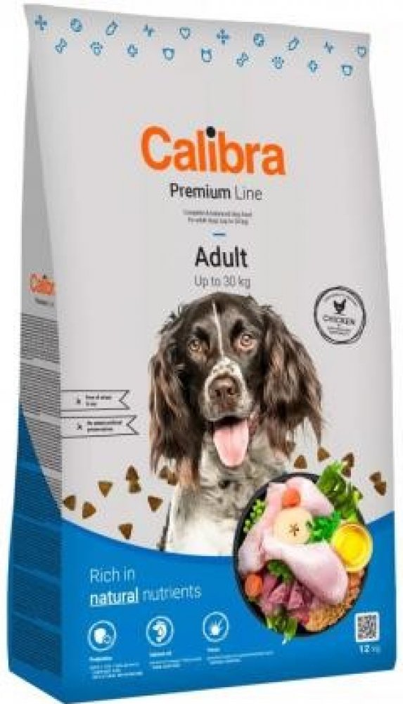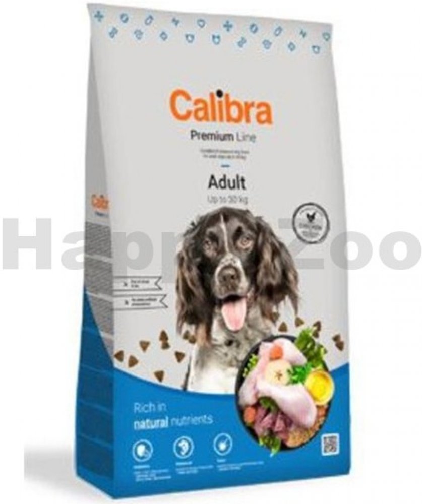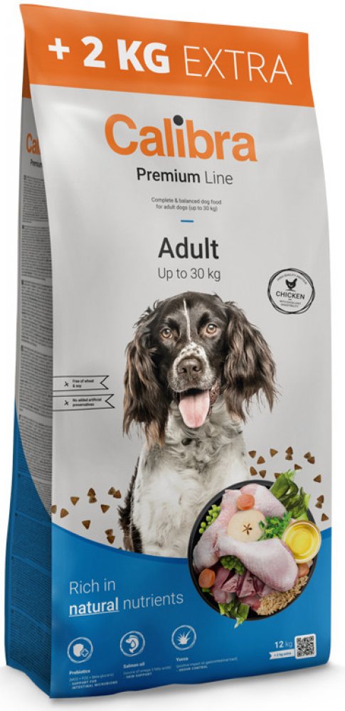 Calibra Dog Premium Adult je kuřecí receptura pro dospělé psy do 30 kg.Jedná se o vysoce kvalitní kompletní suché krmivo pro všechny psí mazlíčky. Nabízí vyvážený poměr všech potřebných živin, vitamínů, minerálů či stopových prvků tak, aby plně zabezpečily všechny výživové nároky zdravého pejska.Tato monoproteinová kuřecí receptura bez pšenice a pšeničného lepku se vyznačuje výbornou stravitelností.Proteiny živočišného původu jsou v celkové výši 75 %. Aditiva na míruPrebiotika - mannan-oligosacharidy (MOS) a frukto-oligosacharidy (FOS) podporují střevní mikroflóru, správnou funkci trávicího traktu a posilují imunitní systém. Betaglukany stimulují a posilují imunitní systém.Olej z lososa - zdroj nenasycených omega 3 mastných kyselin (EPA, DHA), které jsou potřeba pro vývoj a funkci mozku, podporu fyziologické funkce kůže a srsti a jejich kvality. Mají také protizánětlivý účinek.Yucca schidigera má detoxikační účinky. Obsahuje chlorofyl, stopové prvky, vitamíny, saponiny a polyfenoly. Působí pozitivně na trávicí trakt, snižuje plynatost a zápach exkrementů. Receptura je bez: pšenice, pšeničného lepku, sóji, přidaných barviv a umělých konzervantů, geneticky modifikovaných surovin Složení: kuřecí protein 35 %, kukuřice, oves 16 %, drůbeží tuk 5 %, sušená jablečná dužina 3 %, pivovarské kvasnice, hydrolyzovaná kuřecí játra 2 %, lososový olej 1 %, mrkev 1 %, hrášek 1 %, sušená petržel 0,5 %, sušené chaluhy 0,4 % (kelpa, Ascophyllum nodosum), glukosamin (260 mg/kg), chondroitin sulfát (160 mg/kg), mannan-oligosacharidy (150 mg/kg), frukto-oligosacharidy (80 mg/kg), Yucca schidigera (80 mg/kg), ß-glukany (40 mg/kg). Analytické složky: