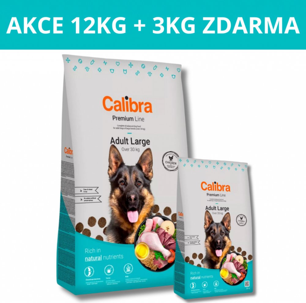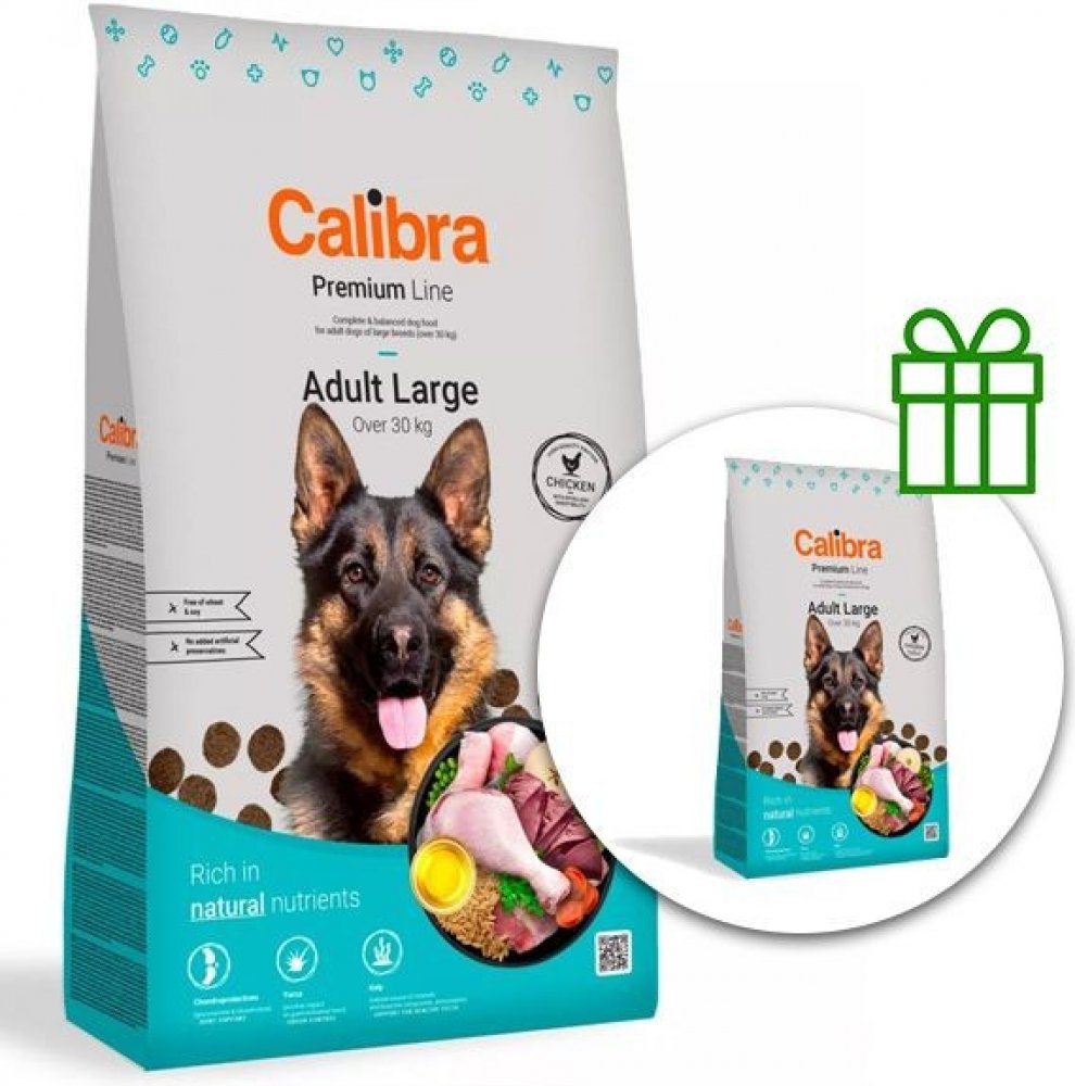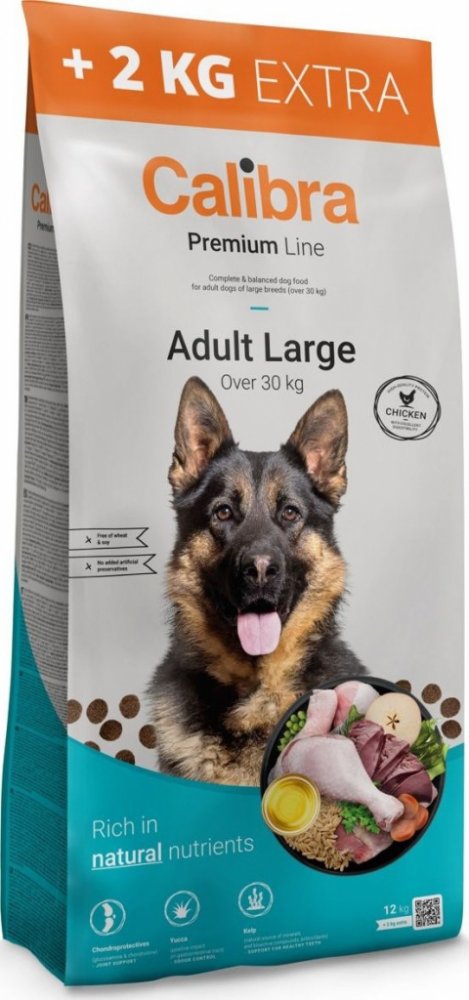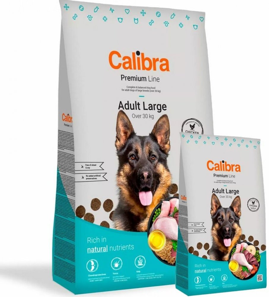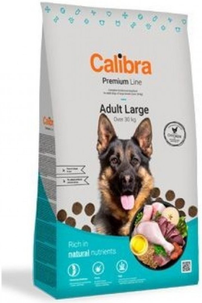Kompletní krmivo Calibra Dog Premium Line Adult Large s vysokým obsahem kuřecího masa pro všechny dospělé psy velkých plemen nad 30 kg. Receptura nabízí vyvážený poměr všech potřebných živin, minerálů, vitamínů a stopových prvků pro zdravý a spokojený život pejska. Bez pšenice a pšeničného lepku.
