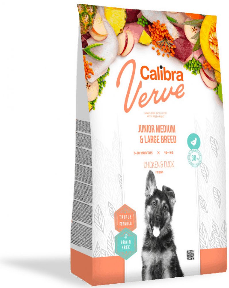 Calibra Dog Verve Junior Medium and Large Breed (Chicken & Duck) je kompletní suché krmivo s čerstvým masem a bez obilovin. Receptura je určená pro mladé psy ve věku 3-30 měsíců středních a velkých plemen s hmotností nad 10 kg.Vysoký obsah čerstvého kuřecího masa 30 % a kvalitní kachní protein je zárukou přirozeně výživné porce, která je v souladu s fyziologickými potřebami psa, potřebné pro správný růst a vývoj mladého organismu.Čerstvé maso je vysoce výživným zdrojem bílkovin, který se vyznačuje atraktivní chutí, a je vhodné i pro citlivé zažívání.Grain free receptura je skvěle stravitelná, obsahuje kvalitní zdroje proteinu, které jsou z 75 % živočišného původu, a také adekvátní množství sacharidů a vlákniny, je tudíž energeticky pečlivě vyvážená.Navíc obsahuje unikátní kombinaci vybraných funkčních aditiv. Tento jedinečný mix – Triple active formula zajistí ten správný efekt této receptury. TRIPLE ACTIVE FORMULAKořen čekanky – je zdrojem inulinu (rozpustné vlákniny s prebiotickou funkcí), podporuje procesy trávení.Ananas – bohatý zdroj minerálů, vitamínů a antioxidantů, obsahuje enzym bromelain. Ten patří do skupiny proteolytických enzymů – podporuje trávení a vykazuje protizánětlivé účinky.Rakytník – jeden z nejbohatších zdrojů bioaktivních látek (vitamínů, antioxidantů, esenciálních mastných kyselin). Podporuje imunitu, cirkulaci krve, trávení a metabolismus. Receptura je bez obilovin, lepku, kukuřice, umělých barviv a přidaných konzervantů, GMO. Složení: čerstvé vykostěné kuřecí maso (30 %), kachní protein (26 %), brambory (11 %), drůbeží tuk, hydrolyzovaný drůbeží protein (10 %), dýně (4 %), hrášek (2 %), hydrolyzovaná kuřecí játra (2 %), lososový olej (2 %), sušená jablečná dužina (2 %), kvasnice, prášek z čekankového kořene (0,2 %), sušený ananas (0,1 %), prebiotika (mannan-oligosacharidy 150 mg/kg, β-glukany 120 mg/kg, frukto-oligosacharidy 100 mg/kg), glukosamin (310 mg/kg), chondroitin sulfát (210 mg/kg), Yucca schidigera (100 mg/kg), sušený rakytník řešetlákový (100 mg/kg). Analytické složky: hrubý protein 34 %, hrubý tuk 17 %, hrubá vláknina 3 %, hrubý popel 7,8 % vlhkost 10 %, vápník 1,3 %, fosfor 1 %, sodík 0,4 %, hořčík 0,1 %, omega-3 mastné kyseliny 0,4 %, omega-6 mastné kyseliny 2,4 %, bílkoviny živočišného původu z celkového obsahu bílkovin 75 %. Metabolizovatelná energie: 3 830 kcal/kg.