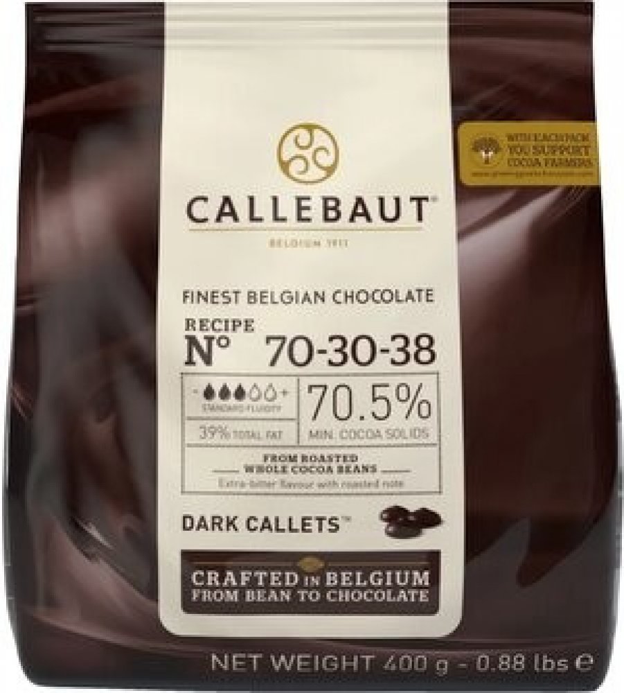 Callebaut 400 g 71 % hořké klasické čočkové plast 30.0 % 540.0 kcal na 100 g 38.9 g na 100 g 26.3 g na 100 g