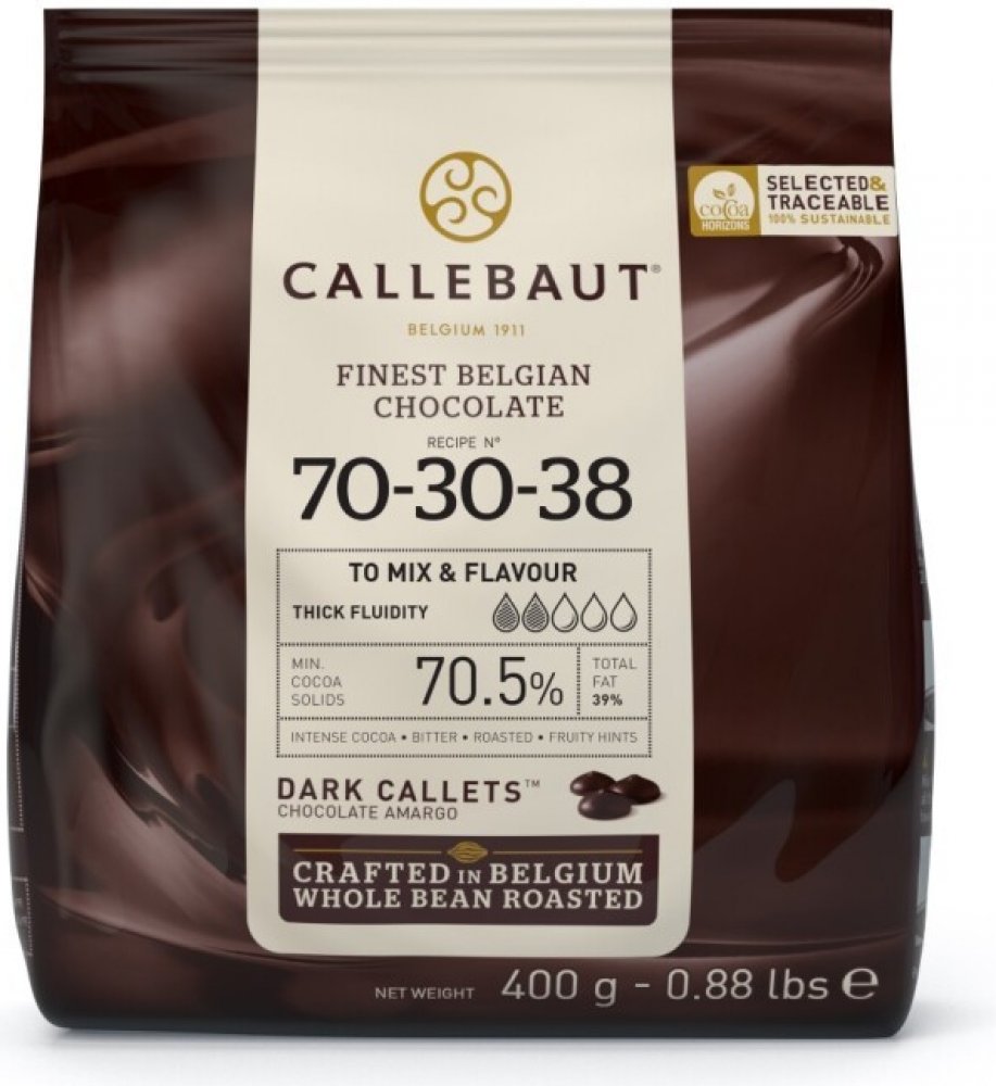Chcete se nechat uchvátit tmavou a intenzivní čokoládou?Callebaut č. 70-30-38 je legendární hořká čokoláda, kterou si oblíbili kuchaři a chocolatiéři po celém světě. Její chuť je plná, vyvážená a hluboká - kombinuje pevný základ praženého kakaa se svěžími ovocnými a silně hořkými tóny.