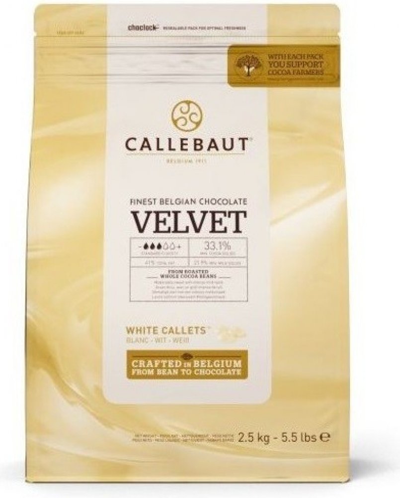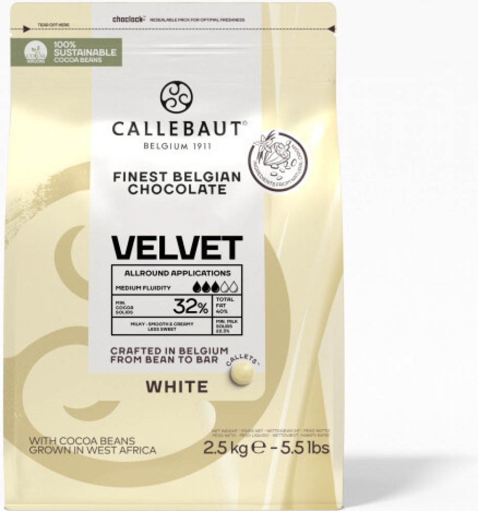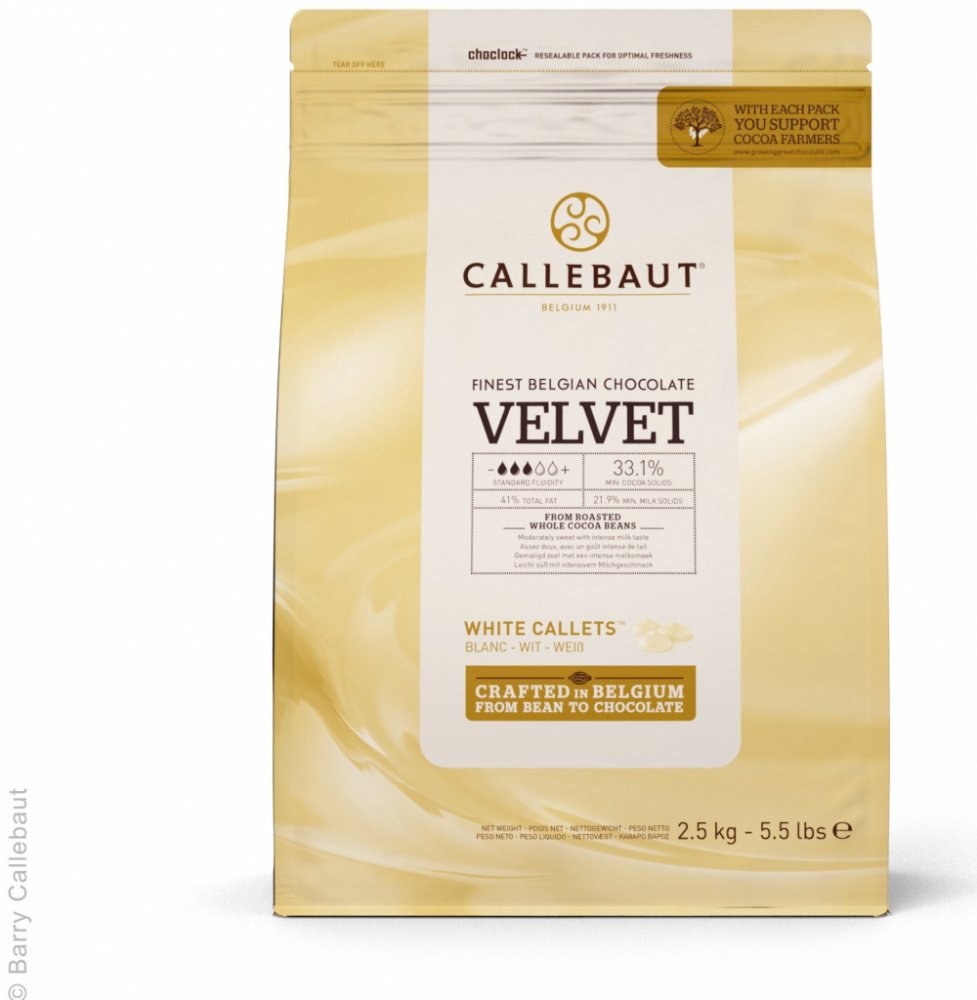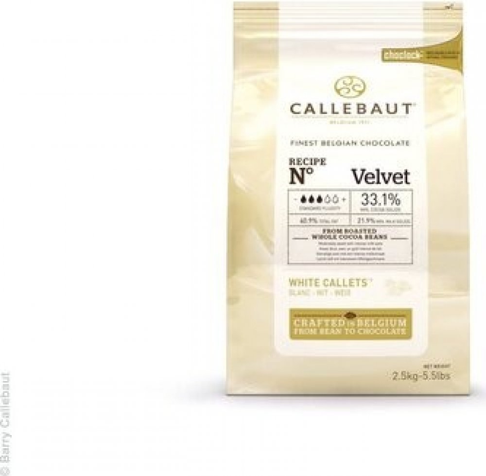 Bílá čokoláda Callebaut Velvet se zvýšeným obsahem kakaové složky na 32 % na úkor obsahu cukru je dodávaná ve formě drobných peciček (callets), které jsou balené v sáčcích po 2,5 kg.