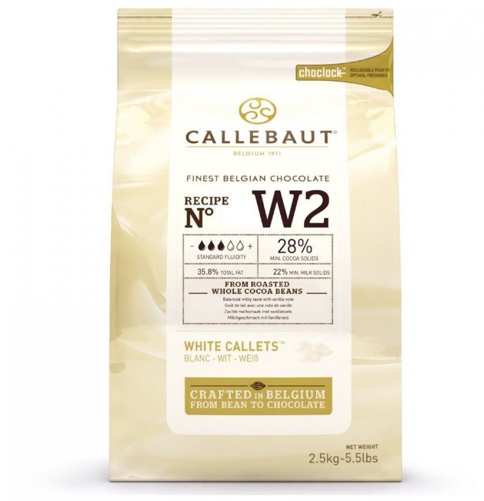 Bílá čokoláda Callebaut W2NV s obsahem kakaa 28 % dodávaná ve formě drobných peciček (callets), které jsou balené v sáčcích po 2,5 kg.