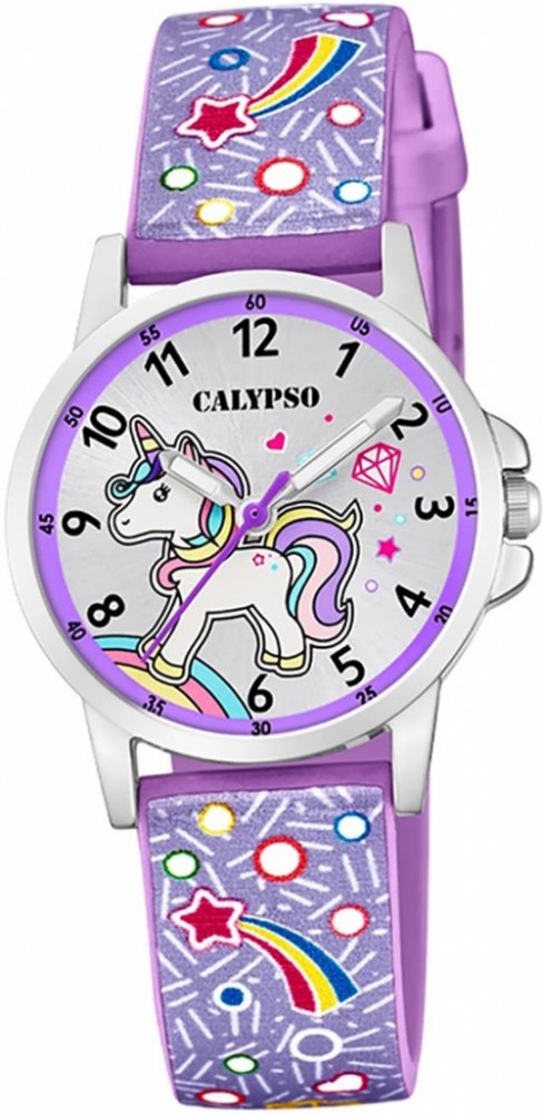 Calypso analogové plast klasické dětské bateriové - quartz pro běžné použití (30–50 m) 27 mm ocel 50 m bateriové 25 g minerální K5776 kulaté fialová stříbrná s luminiscencí trnová spona 1.4 cm na ruku pohádkové s arabskými číslicemi stříbrná ocel 2.7 cm malé pevná ocel s nenáročnou údržbou (quartz)