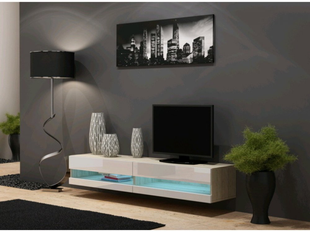 Provedení: Luxusní televizní stolek Vigo New zaujme především svým velice moderním a nadčasovým designem. Je vyroben z kvalitního lamina. Korpus je vyroben v barevném provedení dub Sonoma mat, dvířka jsou z MDF v provedení bílá lesk. Stolek je závěsný a obsahuje otevírací systém dvířek Push/Click Je dodáván v demontu.