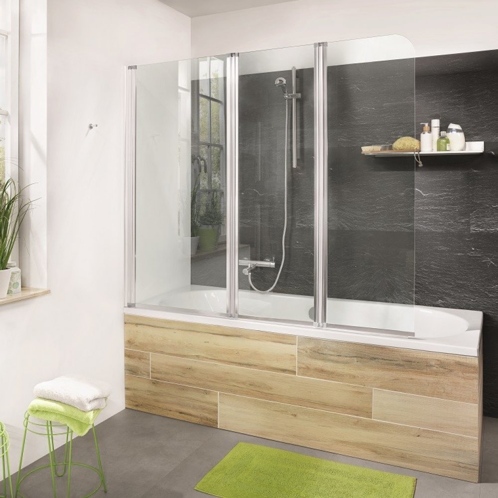 Třídílná vanová zástěna Camargue 140 × 155 cm nabízí dokonalou ochranu koupelny proti stříkající vodě při umývání. Je vyrobena z tvrzeného bezpečnostního skla 4 mm a je opatřena hliníkovým profilem. Výhodou této zástěny jsou panty otočné o 180°. Šířka jednotlivých částí zástěny je 66,5/46/42,5 cm.