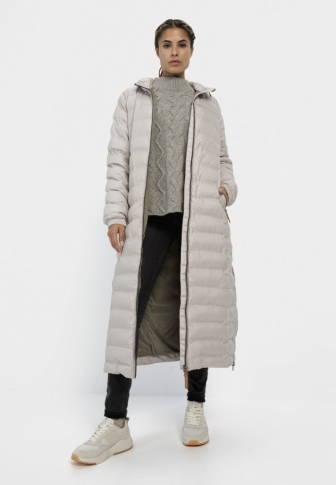 Prošívaný dámský dlouhý kabát s kapucí. Lehce projmutý střih, zapínání na dvojcestný zip. Kapuca je přišitá napevno, vyšší stojáček, který chrání krk před lezavým větrem, dvě boční výpustkové kapsy. Materiálové složení je lehké, avšak pevné, vysoce výhřevné a velmi pohodlné na nošení. Sportovně-elegantní základ zimních outfitů.