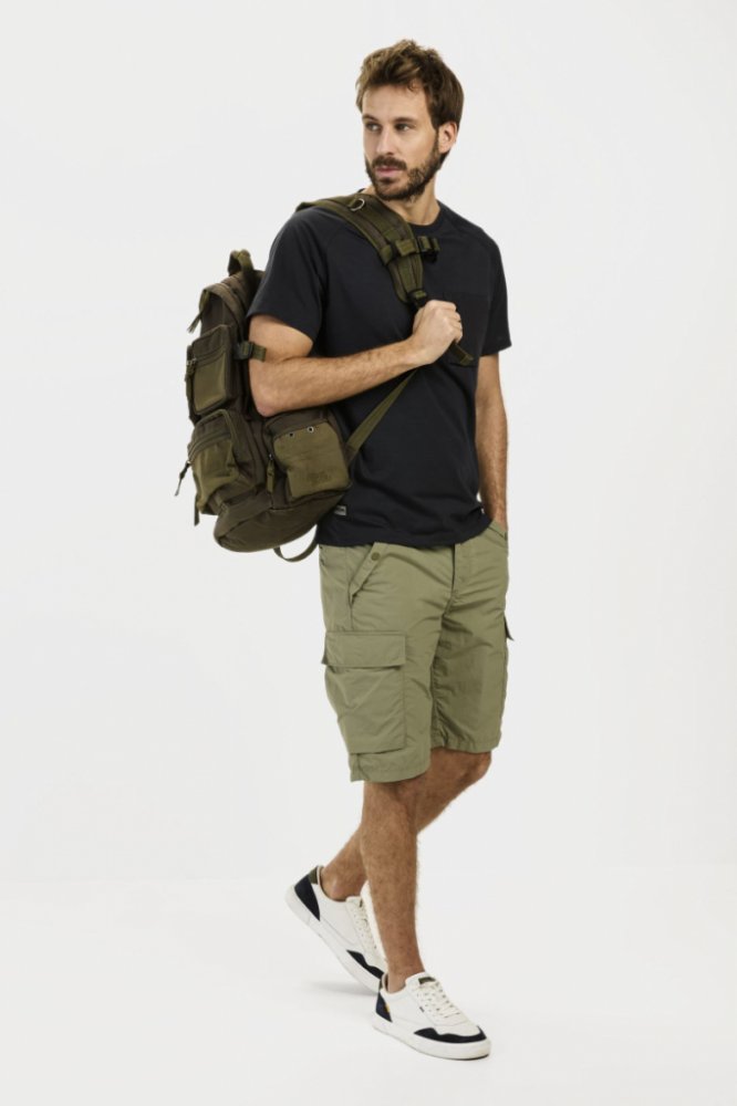 Pánské šortky s nakládanými kapsami na stehnech. Rovně střižené kalhoty s délkou ke kolenům, standardní výška pasu. Klasické zapínání nohavic, poutka na pásek, dvě šikmé boční a dvě zadní našité kapsy. Minimalistické označení značky. Materiálové složení tvoří příjemně měkká tkanina z bavlněného vlákna prvotřídní kvality s příměsí elastanu, které je zárukou prodyšnosti a vysoce komfortního pocitu během nošení. Praktický kousek, který se stane oblíbenou součástí vašich volnočasových outfitů.