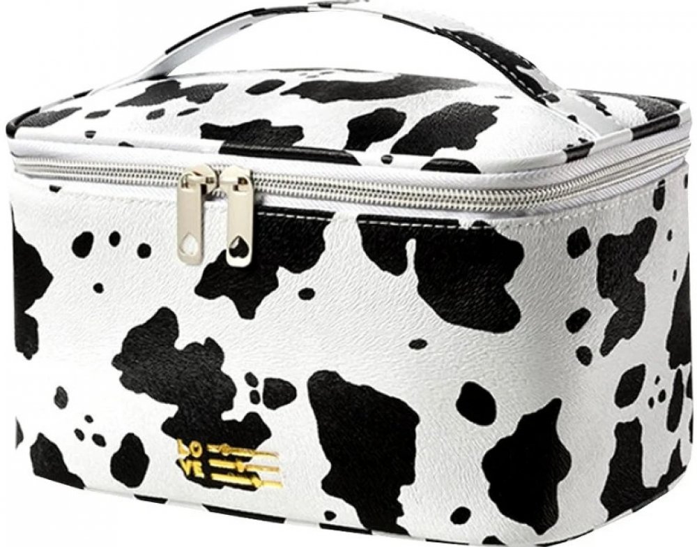 Design tohoto kosmetického pouzdra je jedinečný - bílý povrch ozdobený nepravidelnými černými skvrnami a fleky dodávajícím mu moderní vzhled. Zlatý nápis v angličtině na tašce dodává luxusní dotek.