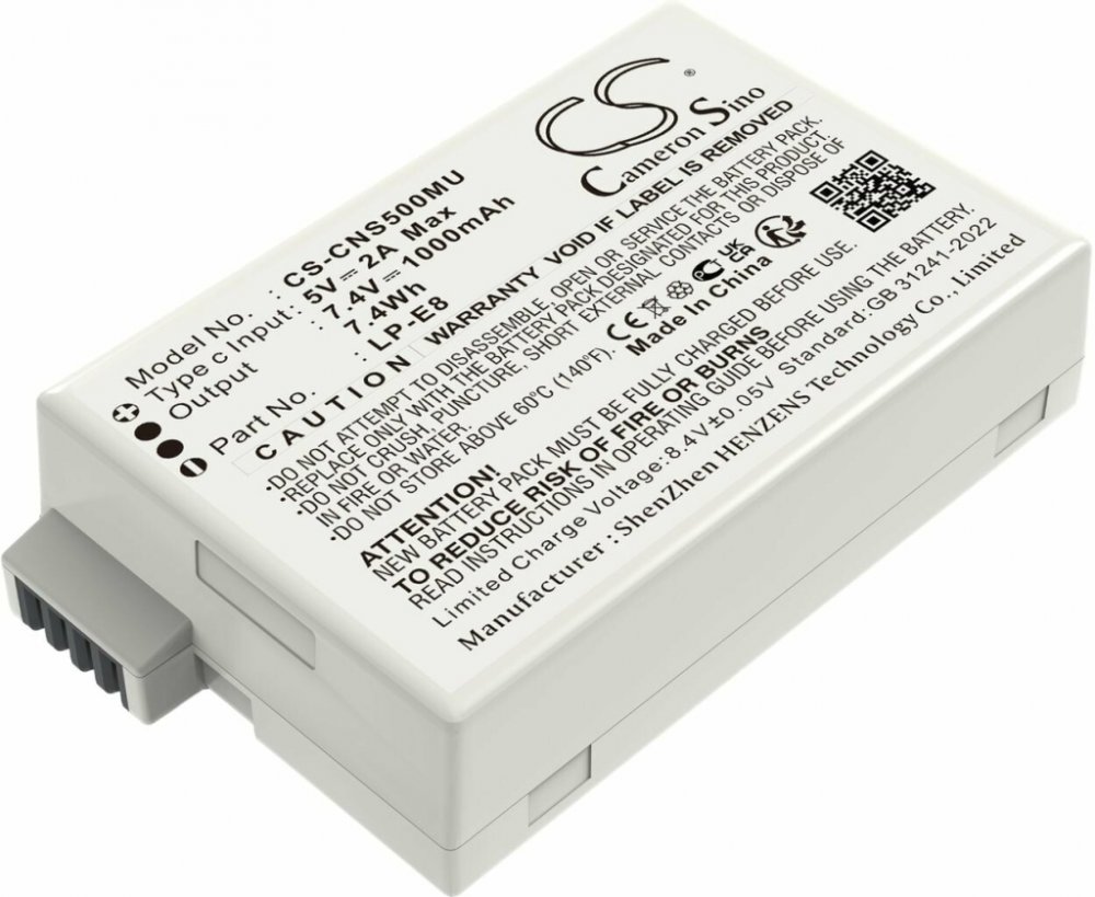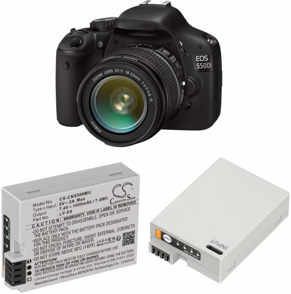 Napětí 7.4 V, typ Li-ion, váha netto 52 g, váha brutto 77 g, kapacita 1000 mAh, výkon 7.4 Wh, barva šedá. EF-S, EOS 550D, EOS 600D, EOS 650D, EOS 700D, EOS Kiss X4, EOS Kiss X5, EOS Kiss X6i, EOS Rebel T2i, EOS Rebel T3i, EOS Rebel T4i, EOS Rebel T5i, Rebel T2i. LP-E8