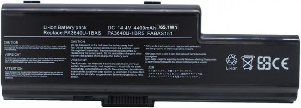 Kapacita 4400 mAh, napětí 14.4 V, váha netto 418.9 g, výkon 63.36 Wh, typ Li-ion, barva černá, váha brutto 568.9 g. Qosmio F50, Qosmio F50-01U, Qosmio F50-108, Qosmio F50-10B, Qosmio F50-10G, Qosmio F50-10K, Qosmio F50-10M, Qosmio F50-10Z, Qosmio F50-111, Qosmio F50-113, Qosmio F50-11E, Qosmio F50-11I, Qosmio F50-11J, Qosmio F50-11K, Qosmio F50-11M, Qosmio F50-11N, Qosmio F50-11O, Qosmio F50-11P, Qosmio F50-11Q, Qosmio F50-11R, Qosmio F50-11S, Qosmio F50-11Y, Qosmio F50-124, Qosmio F50-125, Qosmio F50-126, Qosmio F50-12A, Qosmio F50-12B, Qosmio F50-12H, Qosmio F50-12J, Qosmio F50-Q551, Qosmio F501, Qosmio F55, Qosmio F55-Q502, Qosmio F55-Q5021, Qosmio F55-Q503. PA3640U-1BAS, PA3640U-1BRS, PABAS121, PABAS151