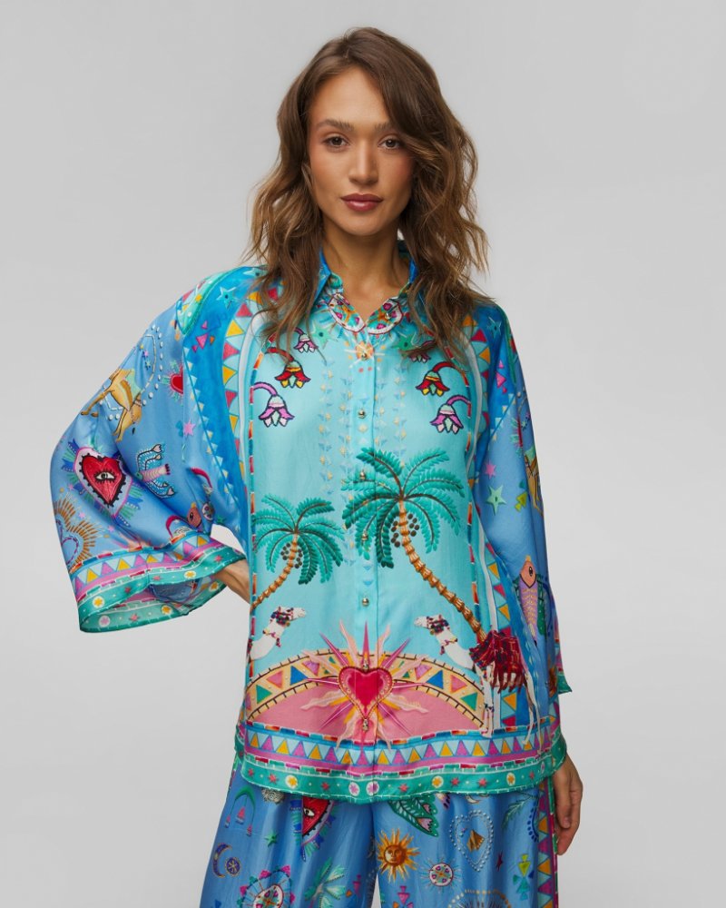 Dámská hedvábná košile Camilla A Painted Village je uměleckým spojením elegance a výrazných detailů.Jemné světle modré hedvábí, zdobené ručně malovanými vzory, podtrhuje jedinečnost tohoto designu.Volný střih, délka po boky a široké, spadlé rukávy vytvářejí harmonickou rovnováhu mezi ležérností a stylem.Zapínání na knoflíky vpředu.Hedvábný kepr je známý svým charakteristickým šikmým vazebním vzorem a hladkou texturou. Vysoká hustota tkaní zaručuje odolnost a pevnost materiálu, zatímco jemný lesk mu dodává luxusní charakter a výjimečnou měkkost na dotek.