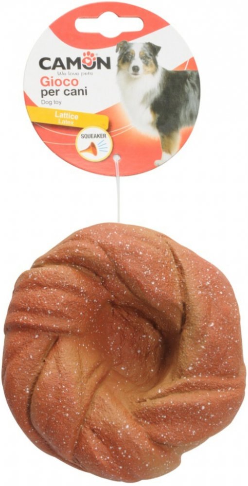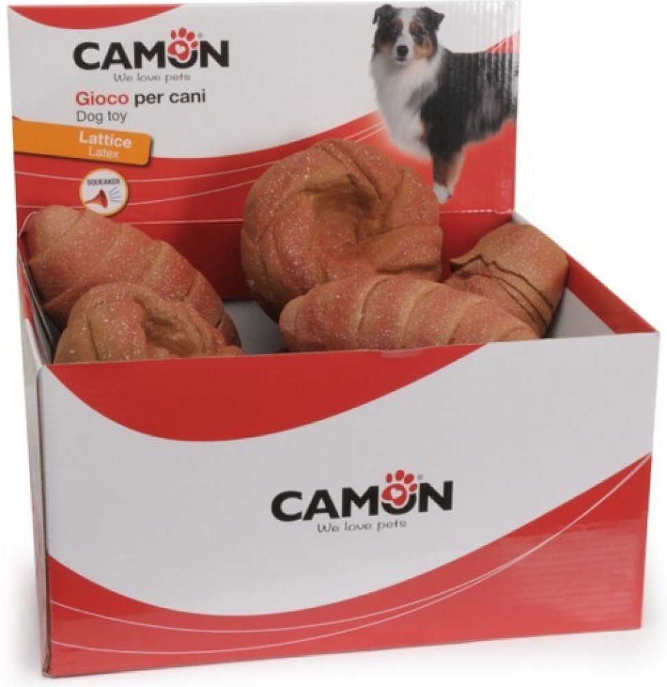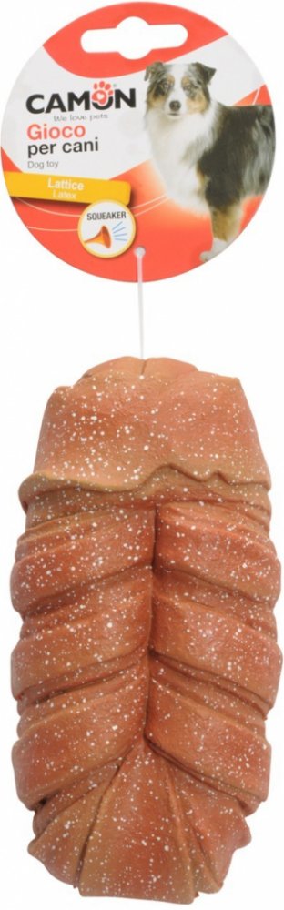 Vtipná a realistická latexová hračka pro psa ve tvaru pletené housky s vatovým polstrováním a vnitřním pískadlem.