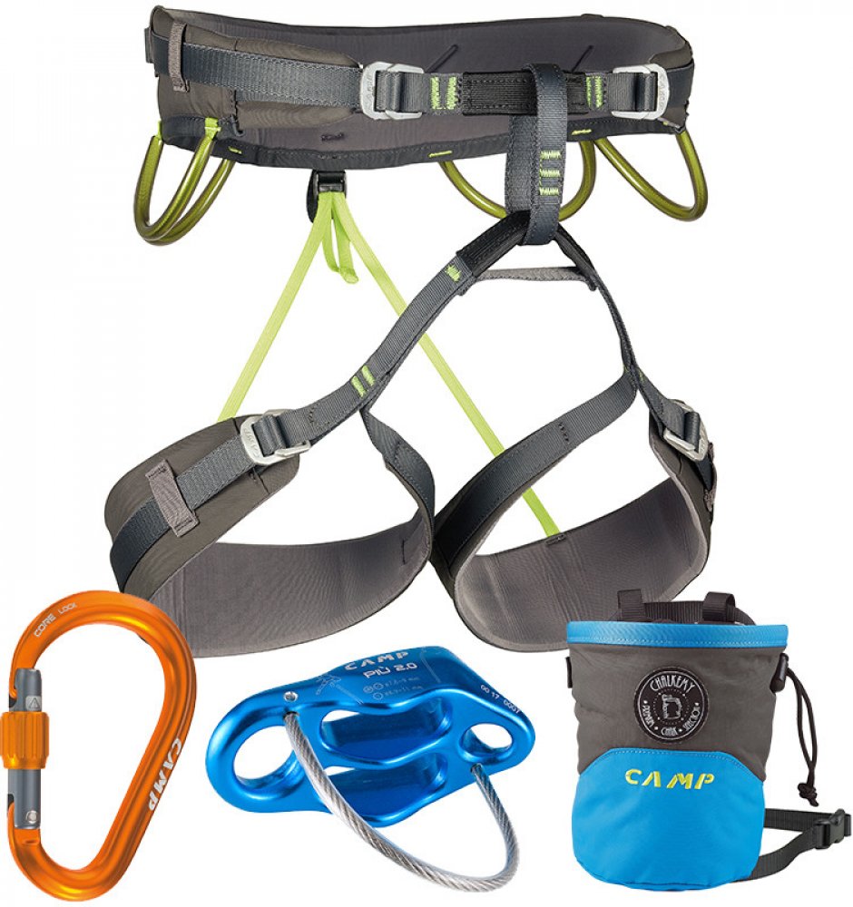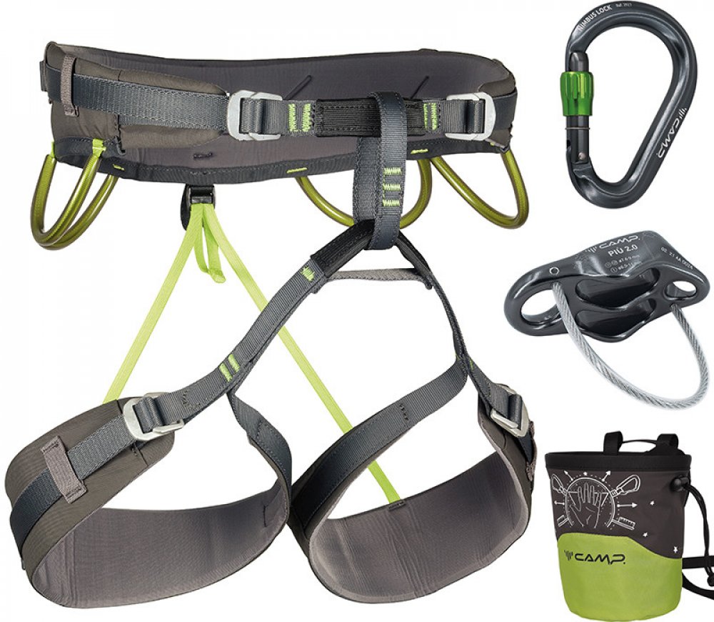 Energy CR 4 Pack je lezecký set sedacího úvazku CAMP Energy CR 4, HMS karabiny CAMP Nimbus Lock, jistítka CAMP Piu 2.0 a mágo pytlíku CAMP Acqualong.