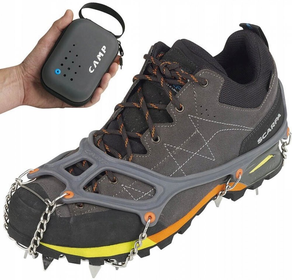 Turistické Nesmeky Camp Ice Master Pro jsou lehké a vysoce účinné příslušenství, které poskytuje vynikající trakci v zledovatělém terénu. Jsou vybaveny pevným systémem zapínání, který zajišťuje bezpečné držení na botě i při dynamickém pohybu. Srdcem konstrukce je sada 16 hrotů z nerezové oceli o délce 15 mm, které umožňují maximální trakci, účinné brzdění a boční stabilitu. Jejich optimální uspořádání zvyšuje jistotu uživatele bez ohledu na terén. Přední část maček je dvojitě kloubená, což umožňuje snadné přizpůsobení různým typům obuvi a povrchů. Navíc použití lehkých řetězů a článků z nerezové oceli činí tento model robustním, ale zároveň velmi lehkým na přenášení.