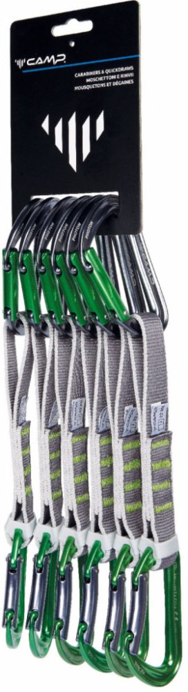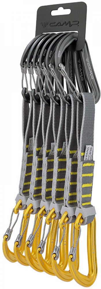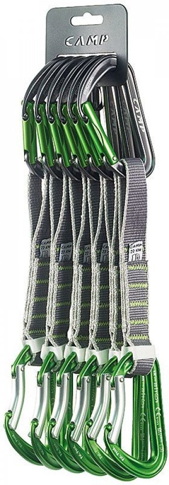 Set 6ks Photon Express s ultralehkými plnými keylockovými karabinami CAMP Photon Straight Gate a CAMP Photon Bent Gate. Karabiny jsou spojeny širokou polyesterovou 18cm smycí. Karabiny CAMP Photon jsou vylepšeny o patentovanou úpravu SphereLock, která přesným výbrusem nosu a zámku karabiny ještě zvyšuje pevnost při zatížení. Další vychytávkou je doplněk Karstop Evo, který zamezuje protáčení karabiny, kterou vede lano.