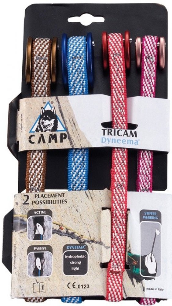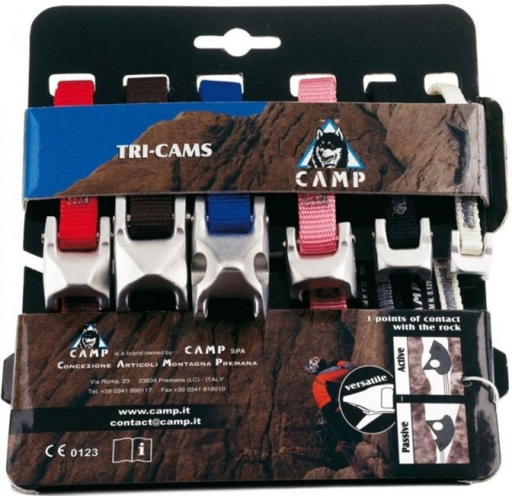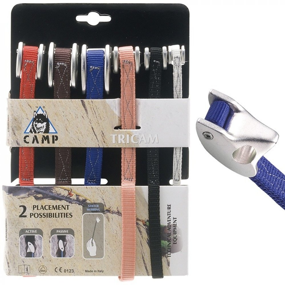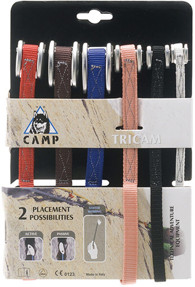 Sada šesti vklíněnců Camp Tricam, které lze použít jako aktivní i pasivní jištění. Tyto vklíněnce lze často umístnit i tam, kde všechny ostatní vklíněnce nebo friendy selhaly. Lze je použít jak v horizontálních spárách, mělkých vertikálních spárách a jamkách. Také je možné Tricam použít i v ledových spárách. Snadná orientace ve velikostech podle barevné smyčky.