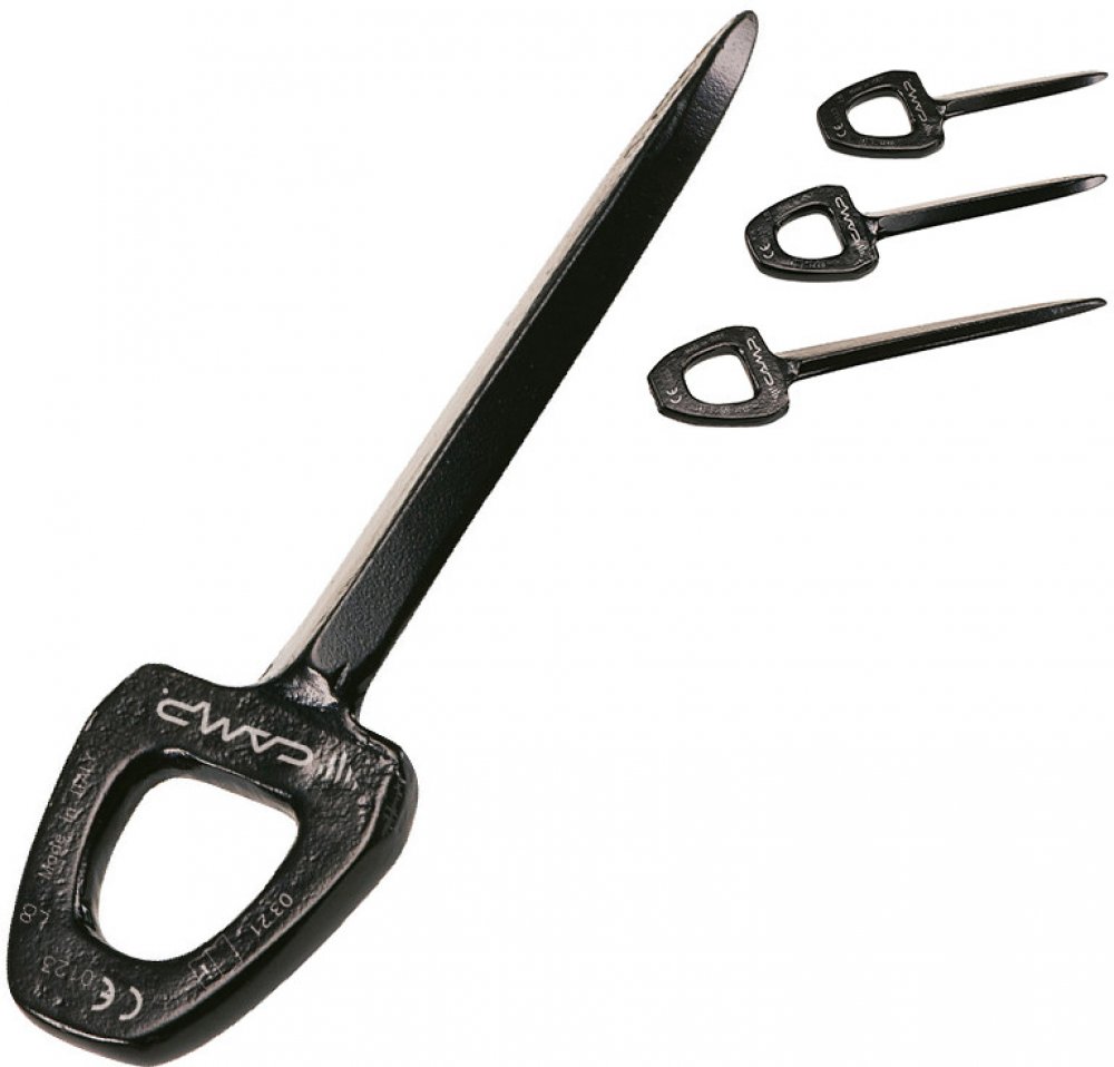 Univerzální kovaná skoba z pochromované oceli vhodná do většiny spár a trhlin. Pro dosažení maximální pevnosti při horizontálním i vertikálním založení je otvor karabiny pootočen o 45° proti noži. K dostání ve třech velikostech.