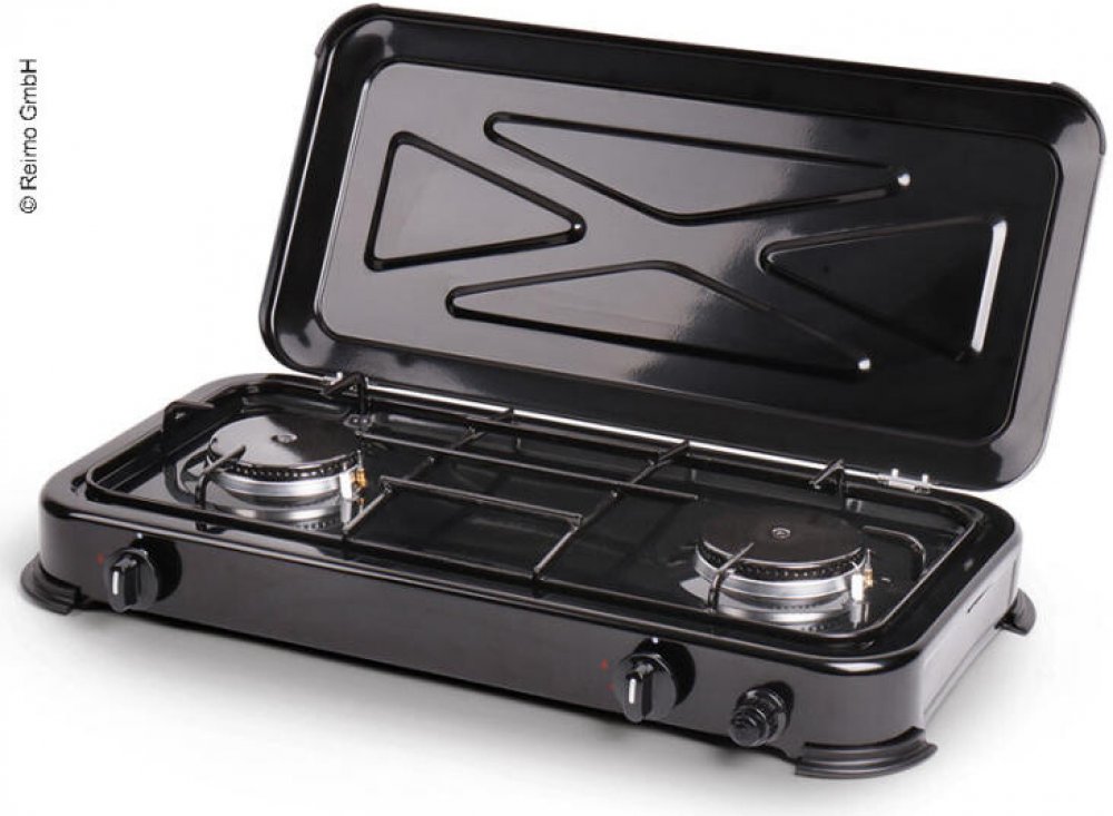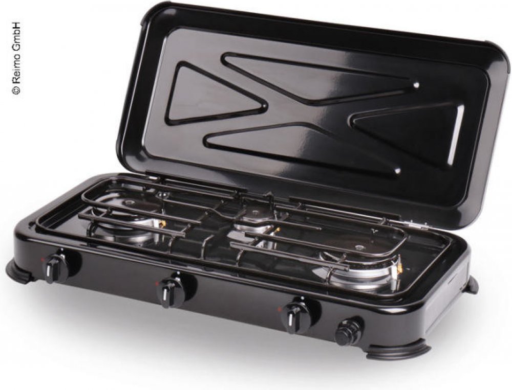 Tříplotýnkový vařič se zapalováním v krásném černém provedení od výrobce Camp4 Tříplotýnkový vařič se zapalováním v krásném černém provedení Včetně protiskluzových nožiček pro bezpečné postavení Provoz 30mbar Vybaven piezo zapalováním Regulovatelné hořáky